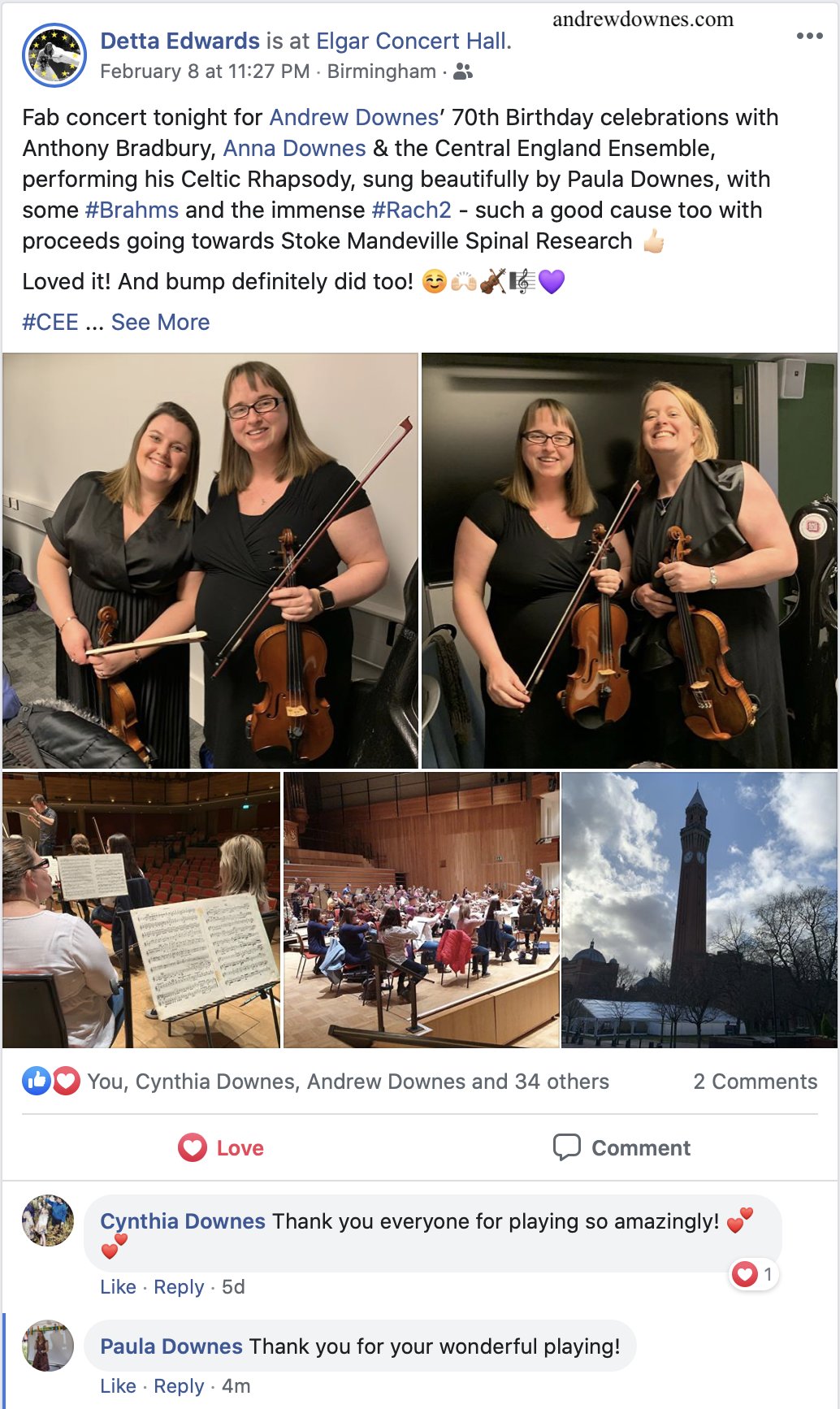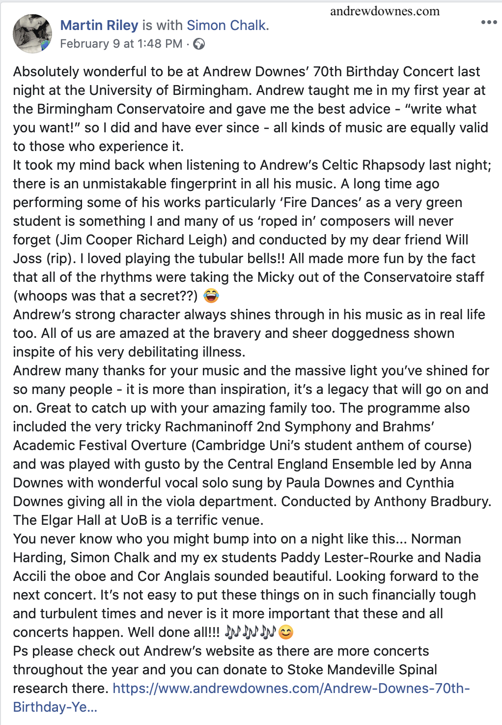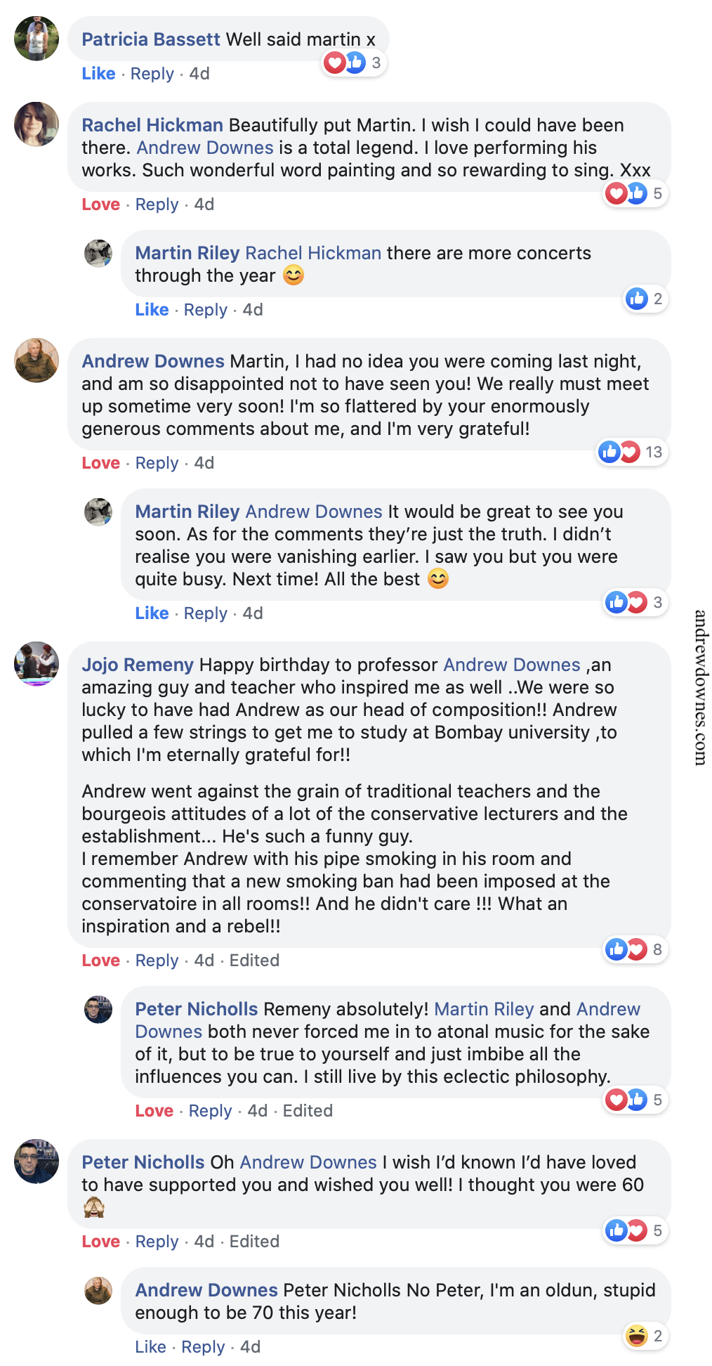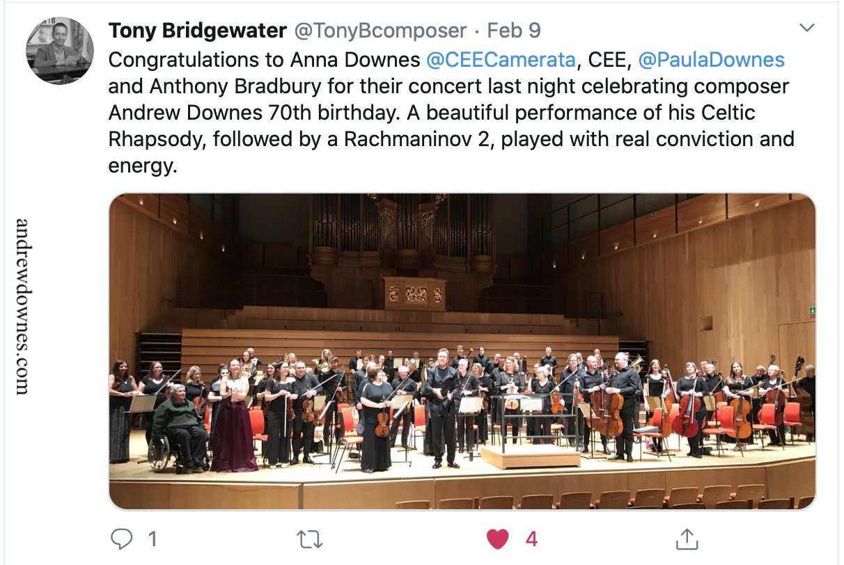 Tonight we are taking part in a special year of concerts to celebrate the 70th Birthday of my father, English composer, Andrew Downes, who was Head of Composition and Creative Studies at Birmingham Conservatoire, and who has written 114 works for all sorts of forces, which have enjoyed performances around the world, by groups including the Czech Philharmonic Orchestra, the Royal Philharmonic Orchestra, Selwyn and Trinity Chapel Choirs, Cambridge, Flute Choirs throughout America, and World-Class Soloists.