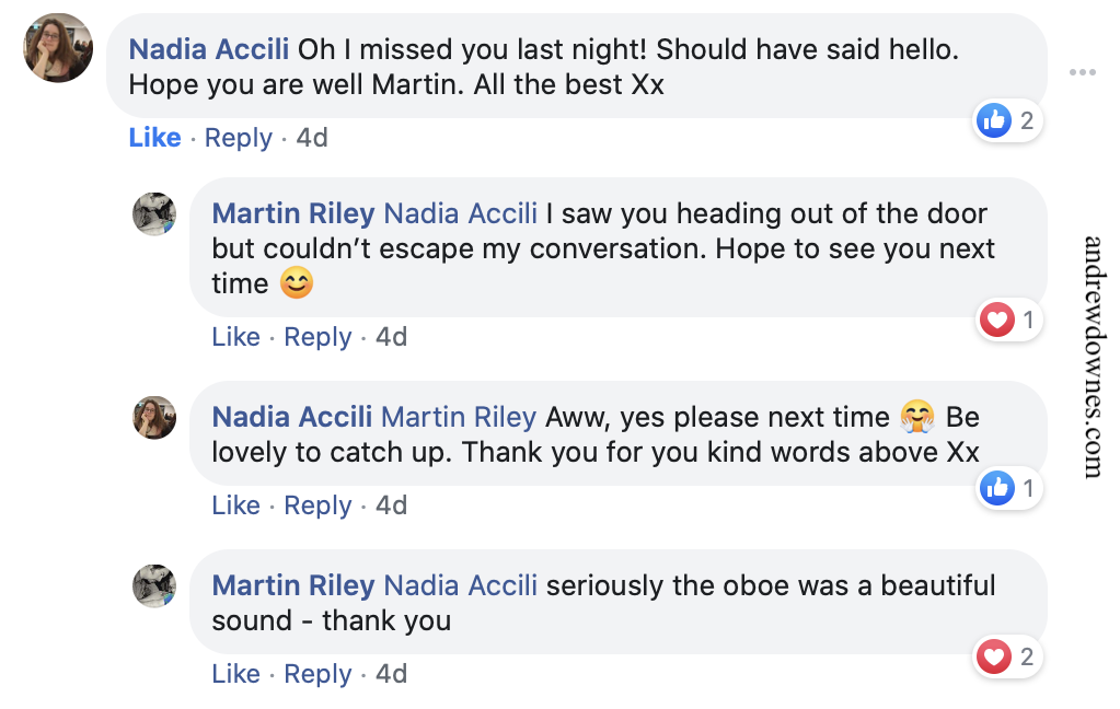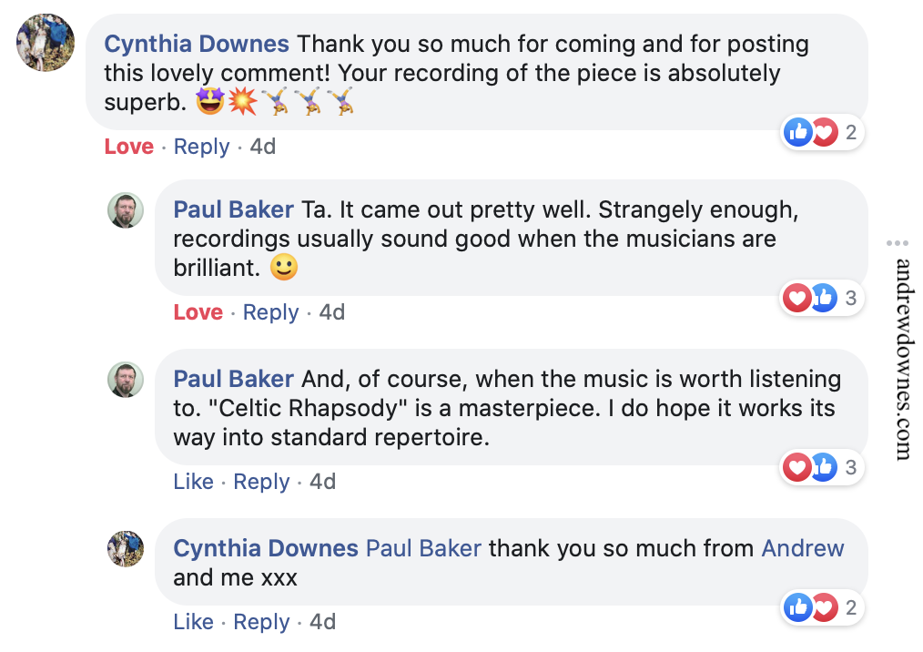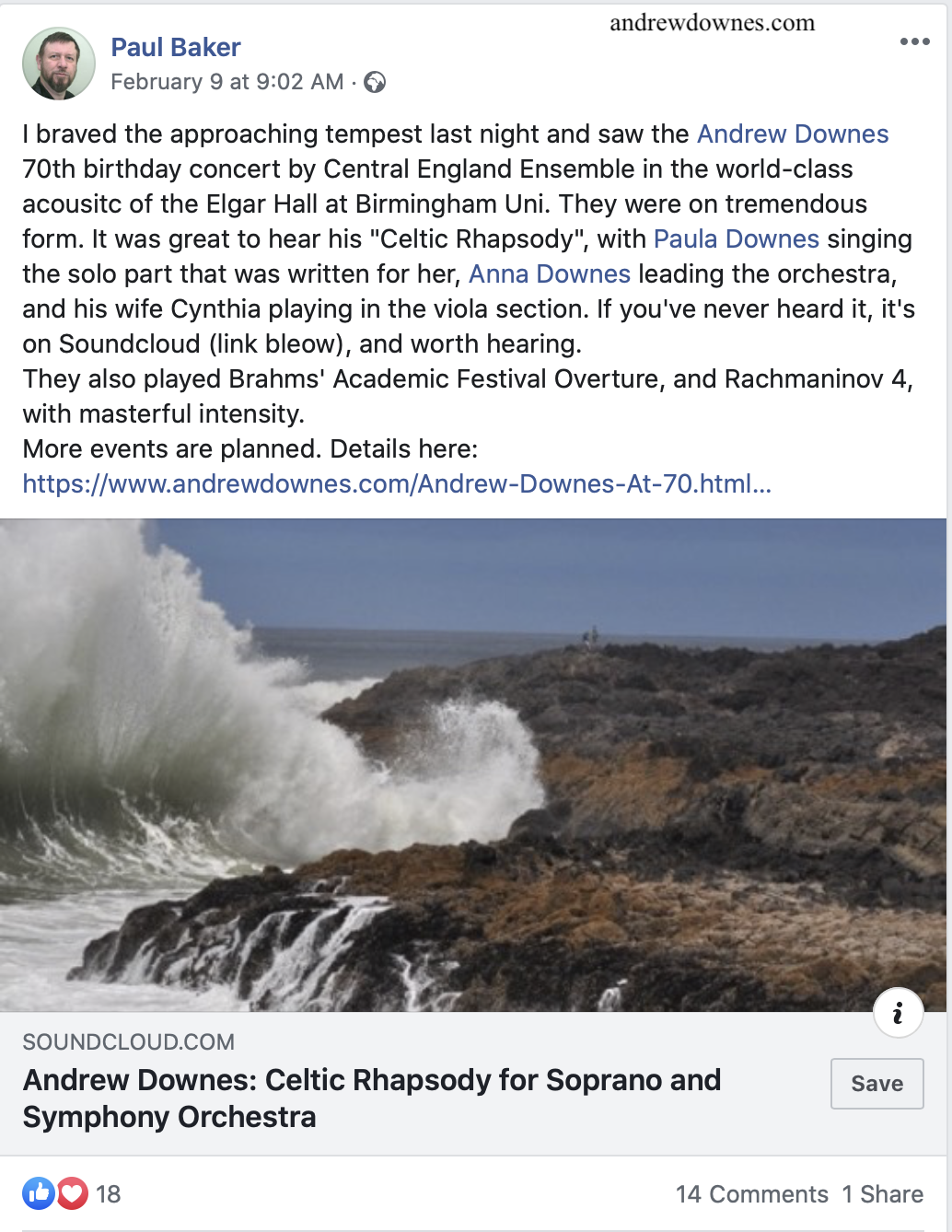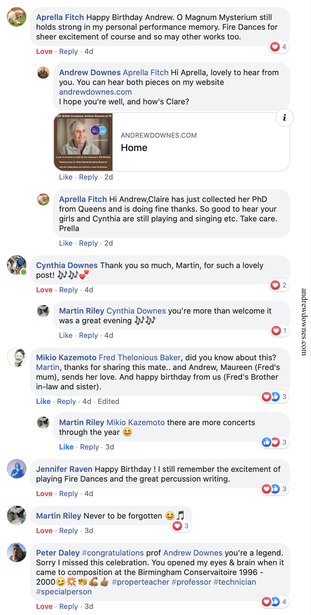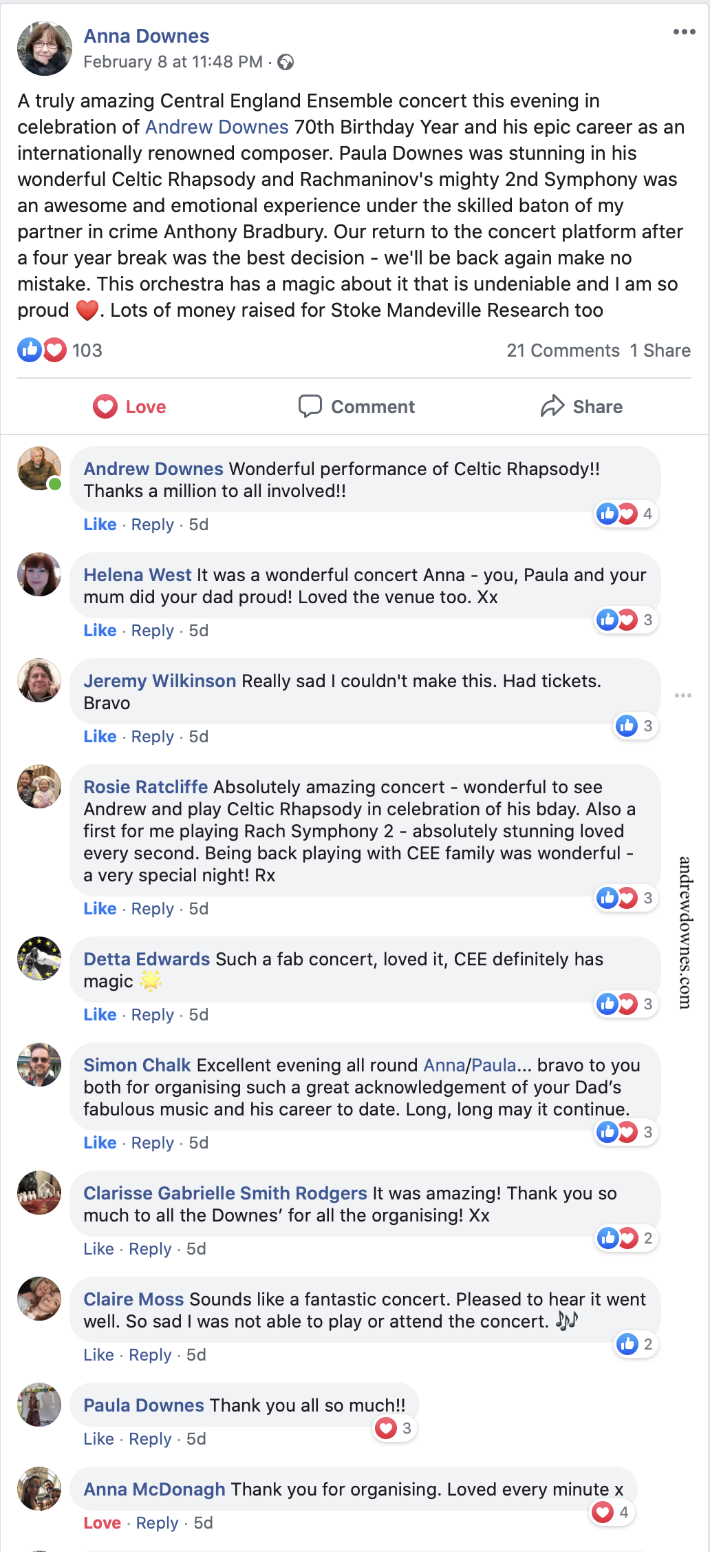 Tonight we are taking part in a special year of concerts to celebrate the 70th Birthday of my father, English composer, Andrew Downes, who was Head of Composition and Creative Studies at Birmingham Conservatoire, and who has written 114 works for all sorts of forces, which have enjoyed performances around the world, by groups including the Czech Philharmonic Orchestra, the Royal Philharmonic Orchestra, Selwyn and Trinity Chapel Choirs, Cambridge, Flute Choirs throughout America, and World-Class Soloists.