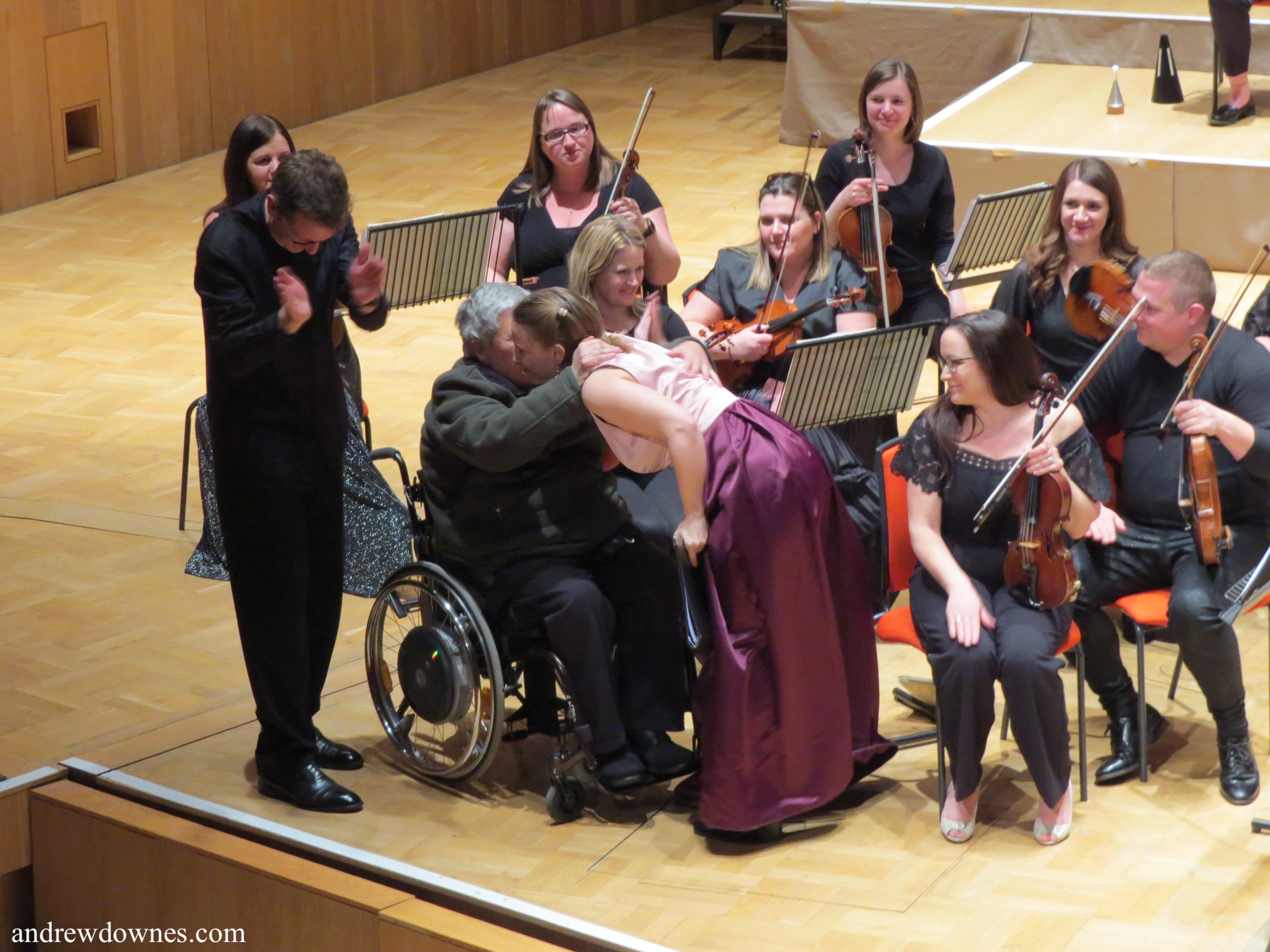 Andrew Downes (in wheelchair), Paula Downes Soprano, Anna Downes Leader, Anthony Bradbury Conductor, Cynthia Downes Viola, Central England Ensemble, Elgar Concert Hall, Birmingham University. Photo by Jenni Bradbury.