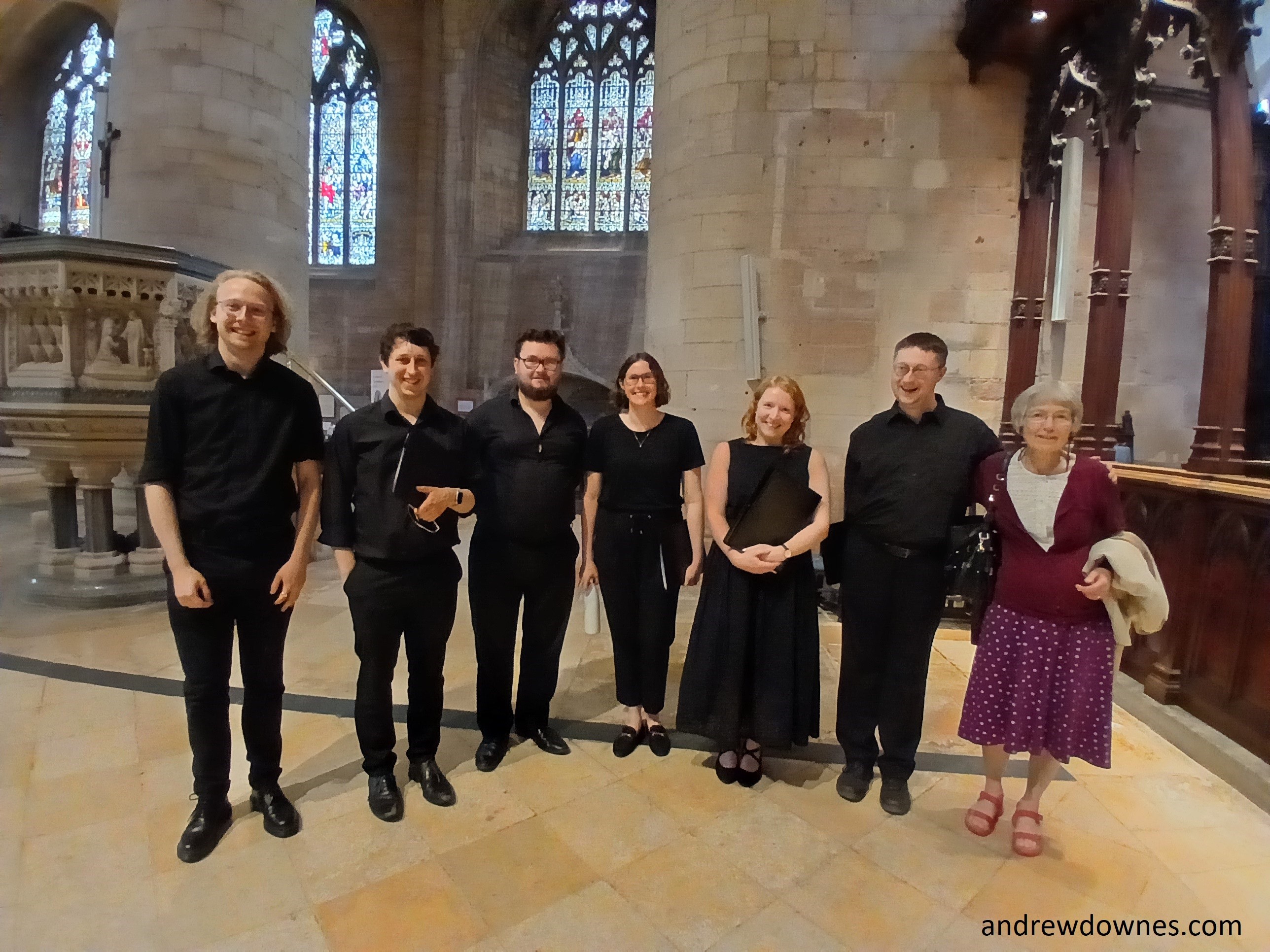 On August 10th 2025, Andrew's anthem I was Glad was exquisitely performed at Evensong in Tewkesbury Abbey by the Ferrabosco Singers, directed by Harley Jones and accompanied by organist Stanley Godfrey. Paula and I attended the service and were deeply affected by their powerful and sensitive performance. I am standing next to Harley Jones in the photo below. Stanley Godfrey is at the other end. Some of the choir members are in the middle.