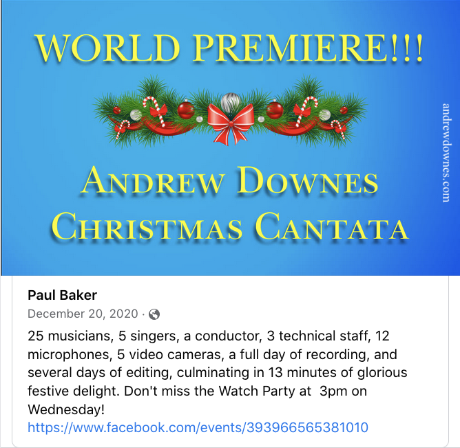 Front page of a Facebook Watch Party: a filmed socially distanced performance of Christmas Cantata for #andrewdownes70, 2020