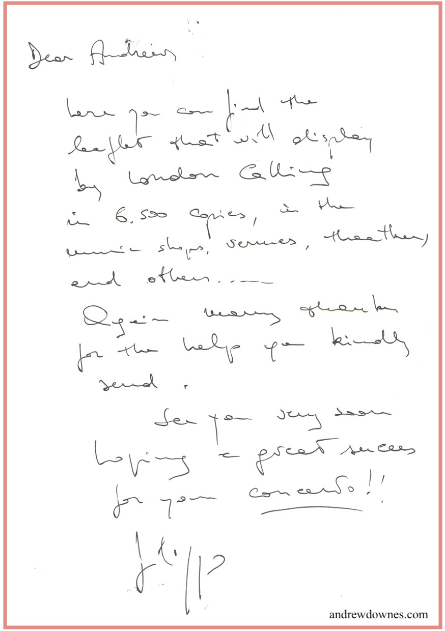 Above: letter from the Director of the Conservatoire of Aubervilliers, Paris, thanking us for the copies music by Andrew which we donated to their Library.