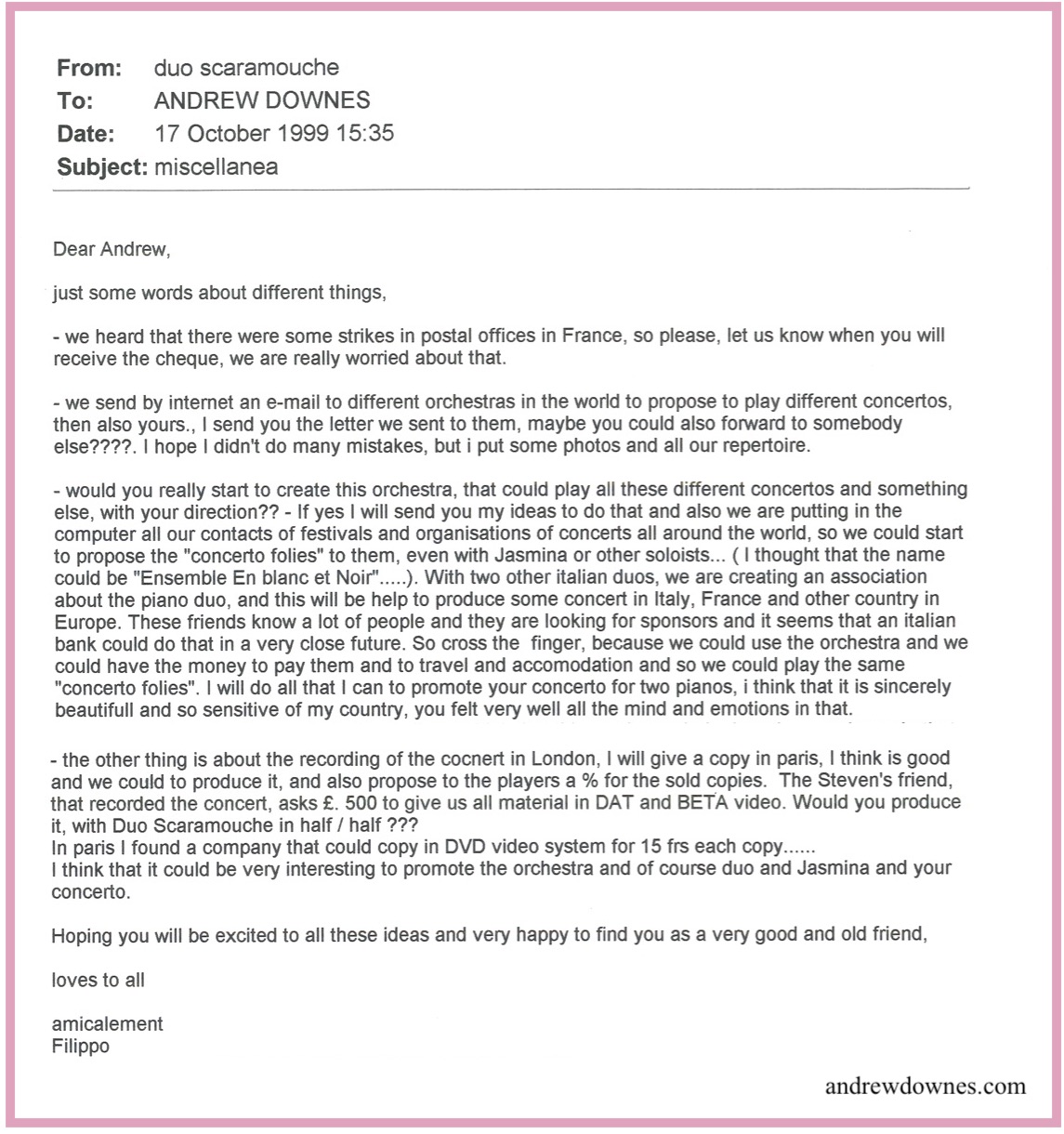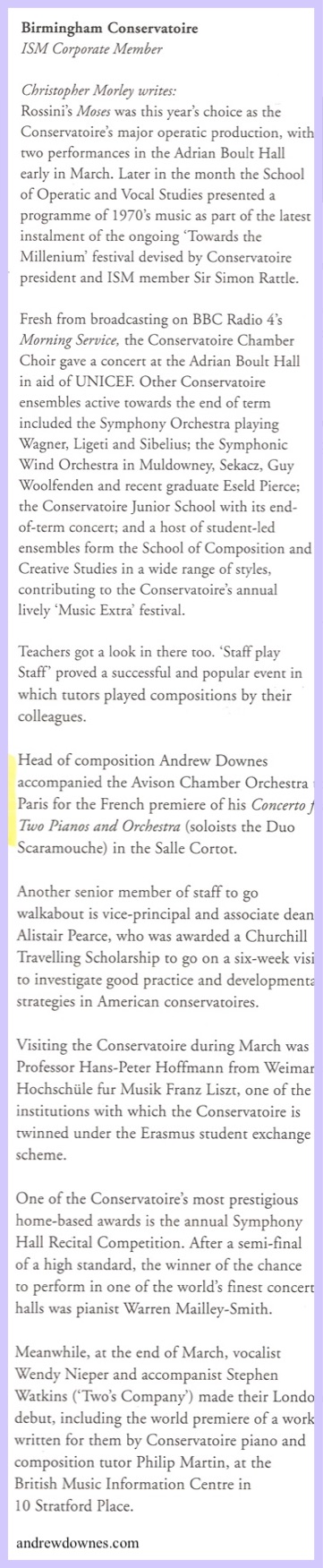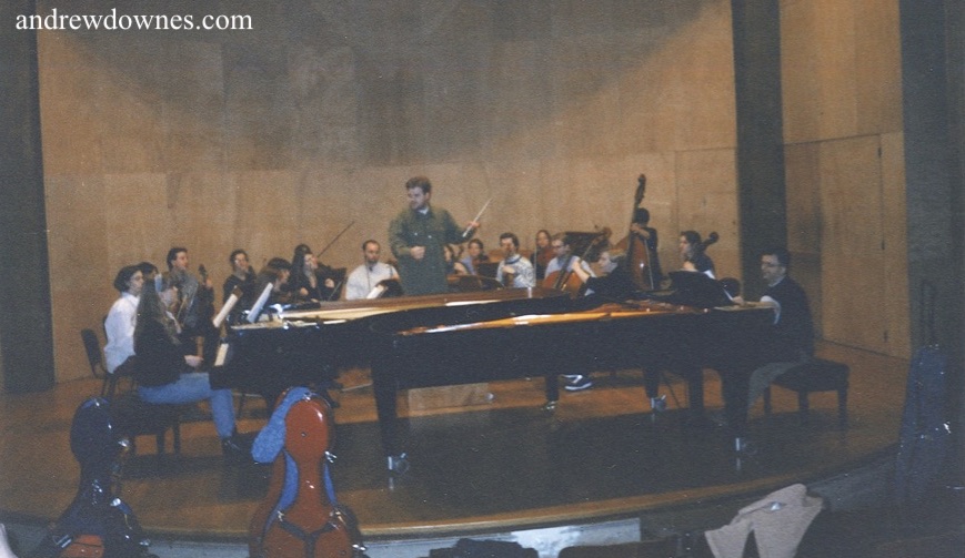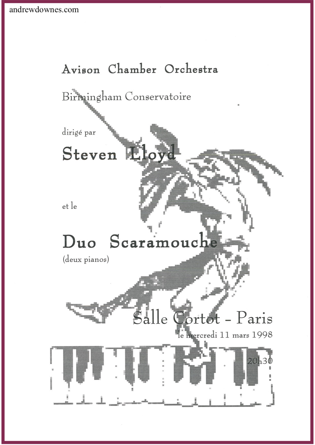 Consequently the world premiere of Andrew’s Concerto took place in the Adrian Boult Hall, Birmingham on November 27th, 1997. The Duo Scaramouche were accompanied by the Avison Chamber Orchestra from Andrew’s School of Composition and Creative Studies. The conductor was Steven Lloyd.