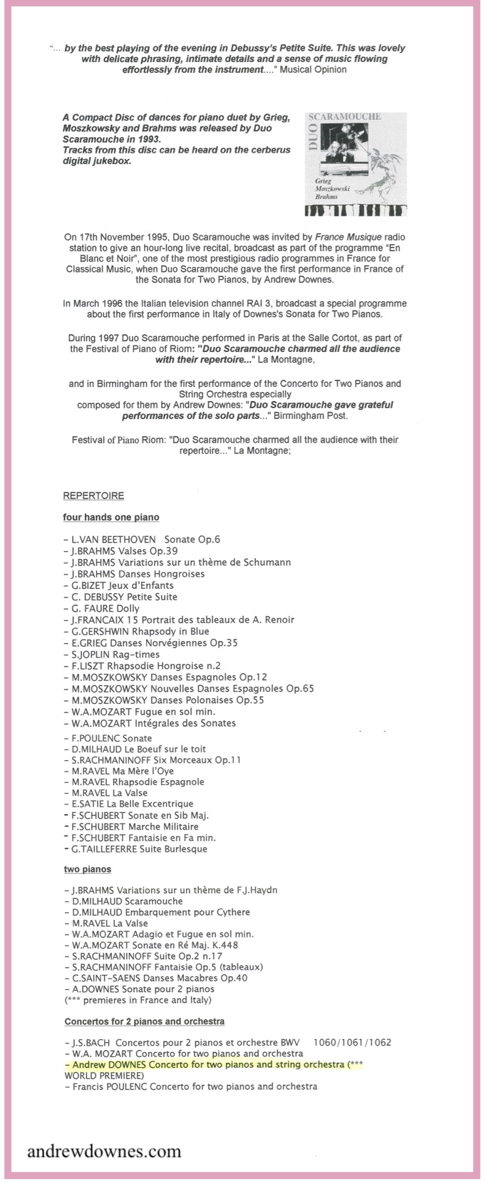 In 1994 Andrew was contacted by the 2 Pianos Duo Scaramouche, Filippo Antonelli and Malvina Renault, who wanted to organise concerts in Conservatoires in the UK and set up liaisons. Andrew was the first to respond to them and organised a recital for them in his School of Composition and Creative Studies. Andrew built up a great relationship with the Duo. They performed his Sonata for 2 Pianos in Great Britain, in Saint-Germain-en-Laye Paris (Malvina’s home city), and on Radio ‘France Musique’. In Italy (Filippo’s home country), they played the Sonata for 2 Pianos on radio, and on TV in a full-length programme filmed at the Chiesa Saint Andrea, Barletta, featuring an interview with Andrew.