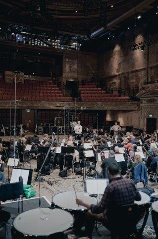 My Mum and I had another good walk around the area the next morning, while David was studying his score in our room. He definitely needed to be left on his own. It was nice to have the time with my Mum and to explore the beautiful local streets. We had brunch in Wetherspoons and bought sandwiches and water for us all for the evening from M&S, since we had no idea what the food situation would be. We then drove up to Ally Pally with all of the scores and carried them in between us. We saw a big lorry with “Philharmonia” on the side outside. We found our dressing room and I lay on the floor to do some stretching. David took himself off to study his score. At about 1:55, David came into the dressing room and said we had half an hour to go before it started. I was trying to remain as calm as possible. We had no idea how this was going to go. Everything was hanging on the next few hours. All of a sudden, David realised the session started at 2! We remembered the schedule had changed at some point during the organisation, and we had got it wrong in our heads! Can you believe it?! We raced along the corridor, entered the massive theatre and got started immediately. The huge orchestra was seated and ready to play, the choir was there. No one had any idea that we had nearly been late for our own recording session!