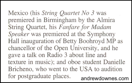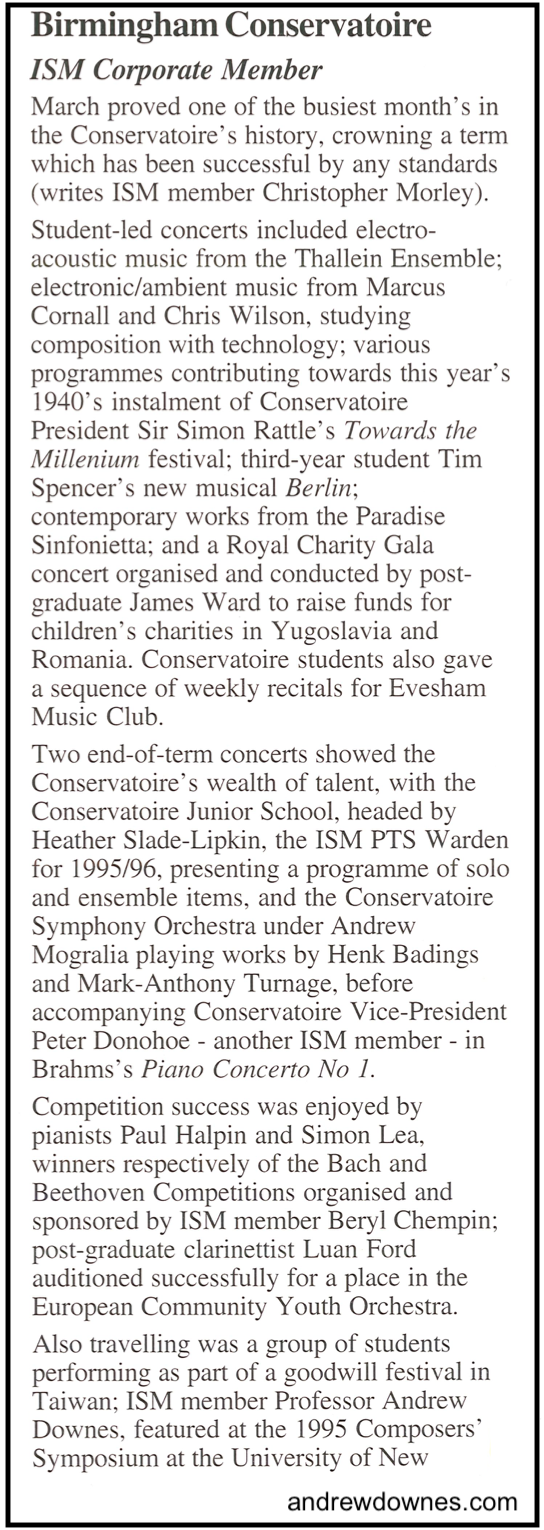 ISM Journal articles spanning a lot of the career of English composer Andrew Downes, about his numerous performances and his School of Composition and Creative Studies at Royal Birmingham Conservatoire in the 1990s and beyond.