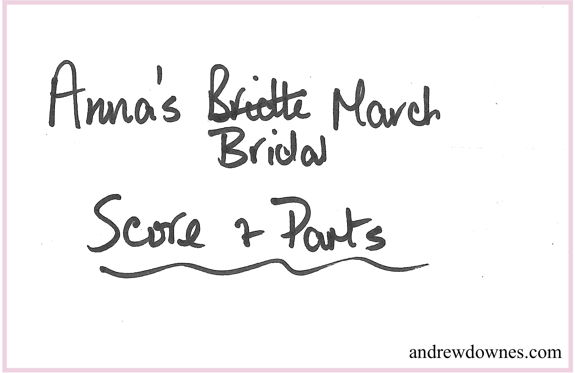 Two days after Christmas 2003, our daughter Anna married Michael Jason Price in our beautiful St John's church, Hagley. Andrew composed a wonderfully rousing Bridal March for the occasion, for Organ (Duncan Honeybourne) 2 Trumpets (Ian and Jo Hattersley) and 2 Horns (Claire Becket and Phil Dawes). The scores are in our cupboard in their original envelope. Andrew, who normally was an excellent speller, got the spelling of 'Bridal' wrong at first! -