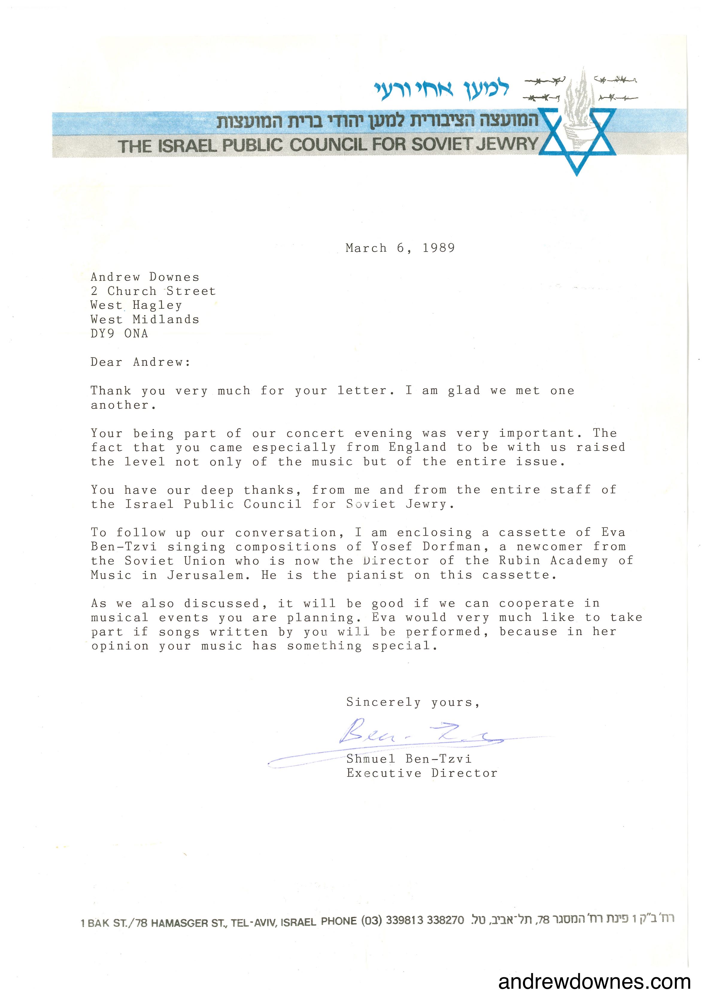 BBC producer, Gillian White, suggested sending copies of the work to a well known Israeli piano duo, Bracha Eden and Alexander Tamir. I duly did this, and to our great surprise and delight, we heard from them that they were going to programme the work in a concert in Tel Aviv, to celebrate the return to Israel of the Refusnik, Elena Keiss Kuna. Andrew was invited to attend this Israeli premiere of his Sonata, which was to take place in the Israel Philharmonic Guest House in January 1989.