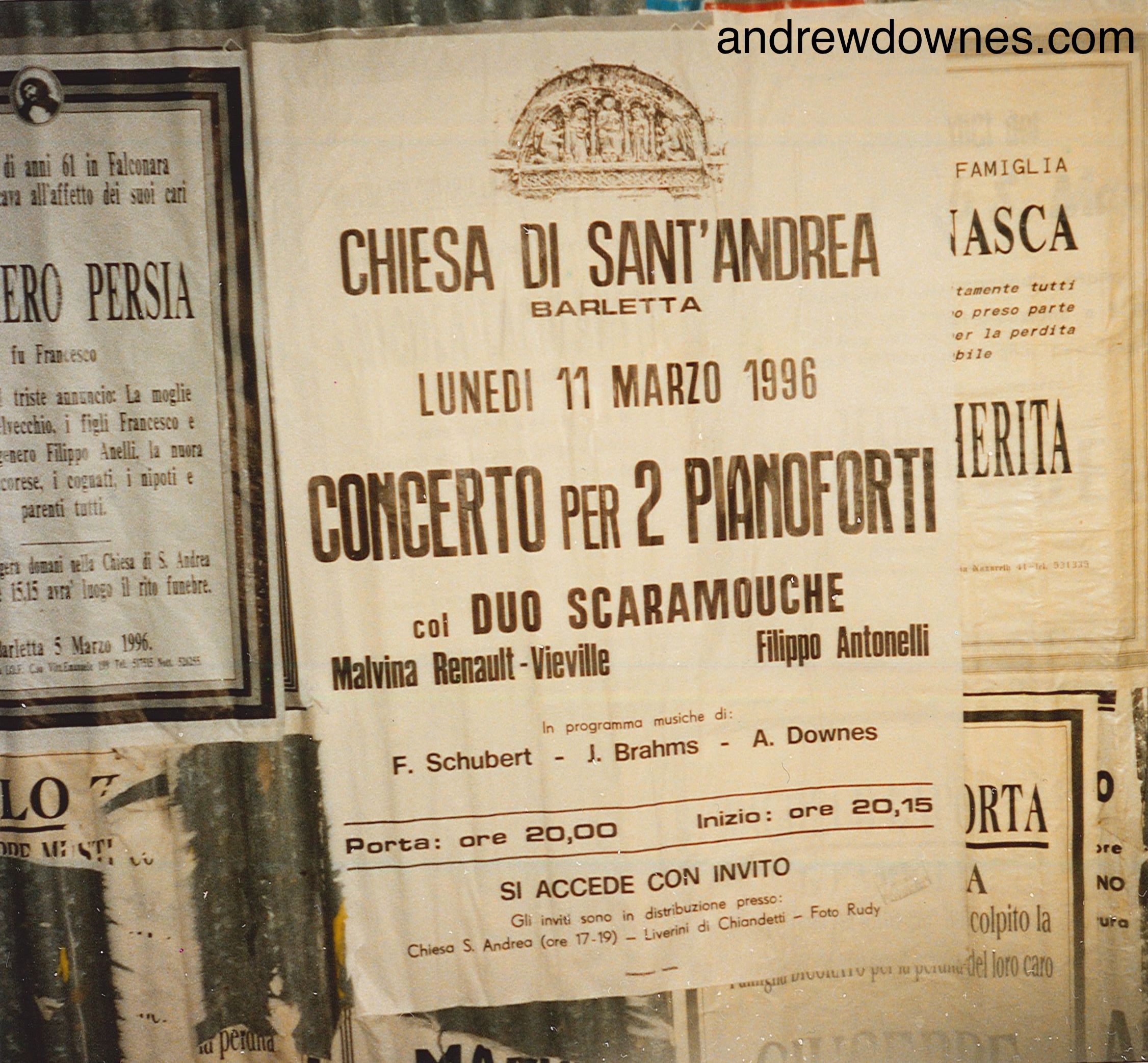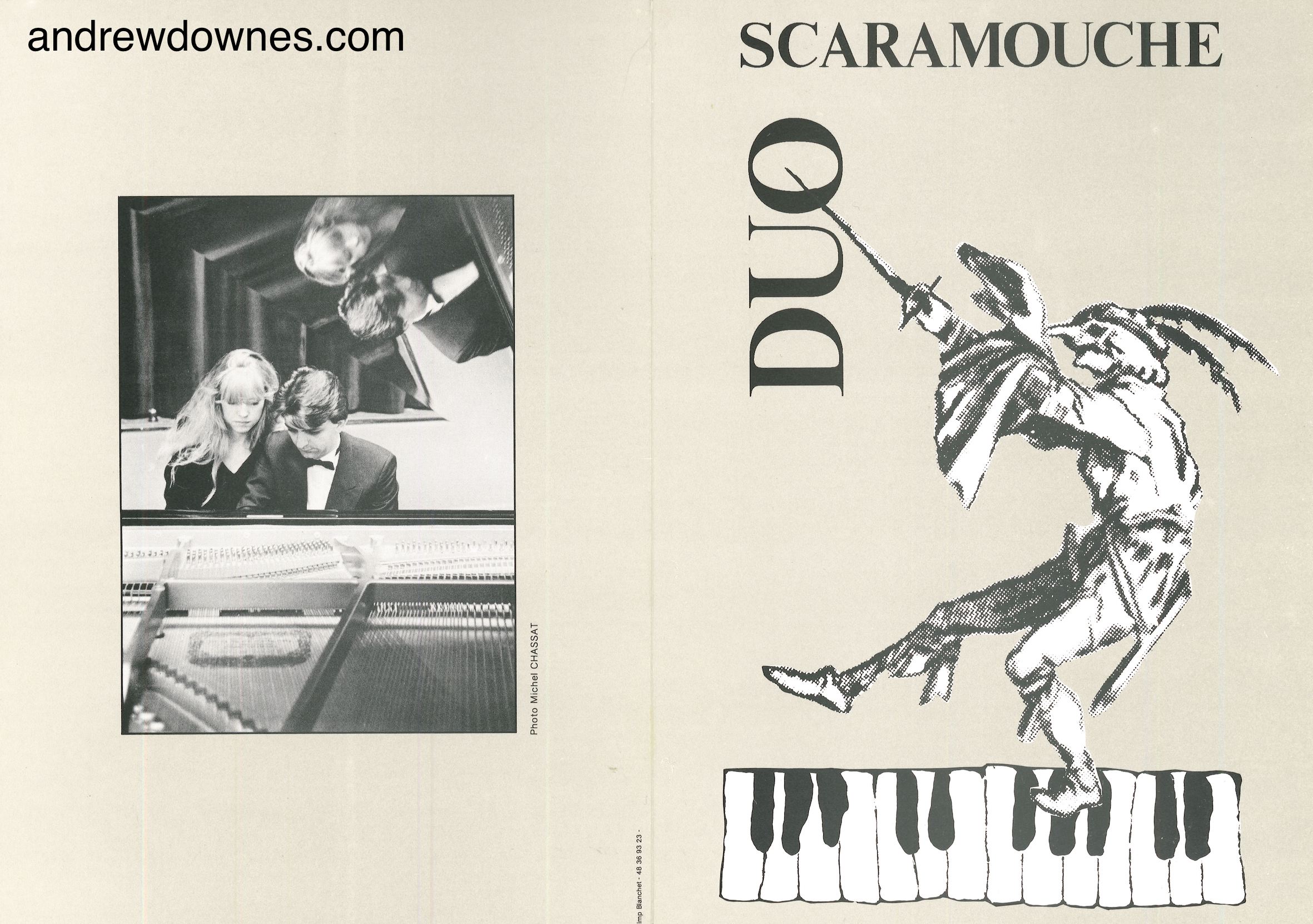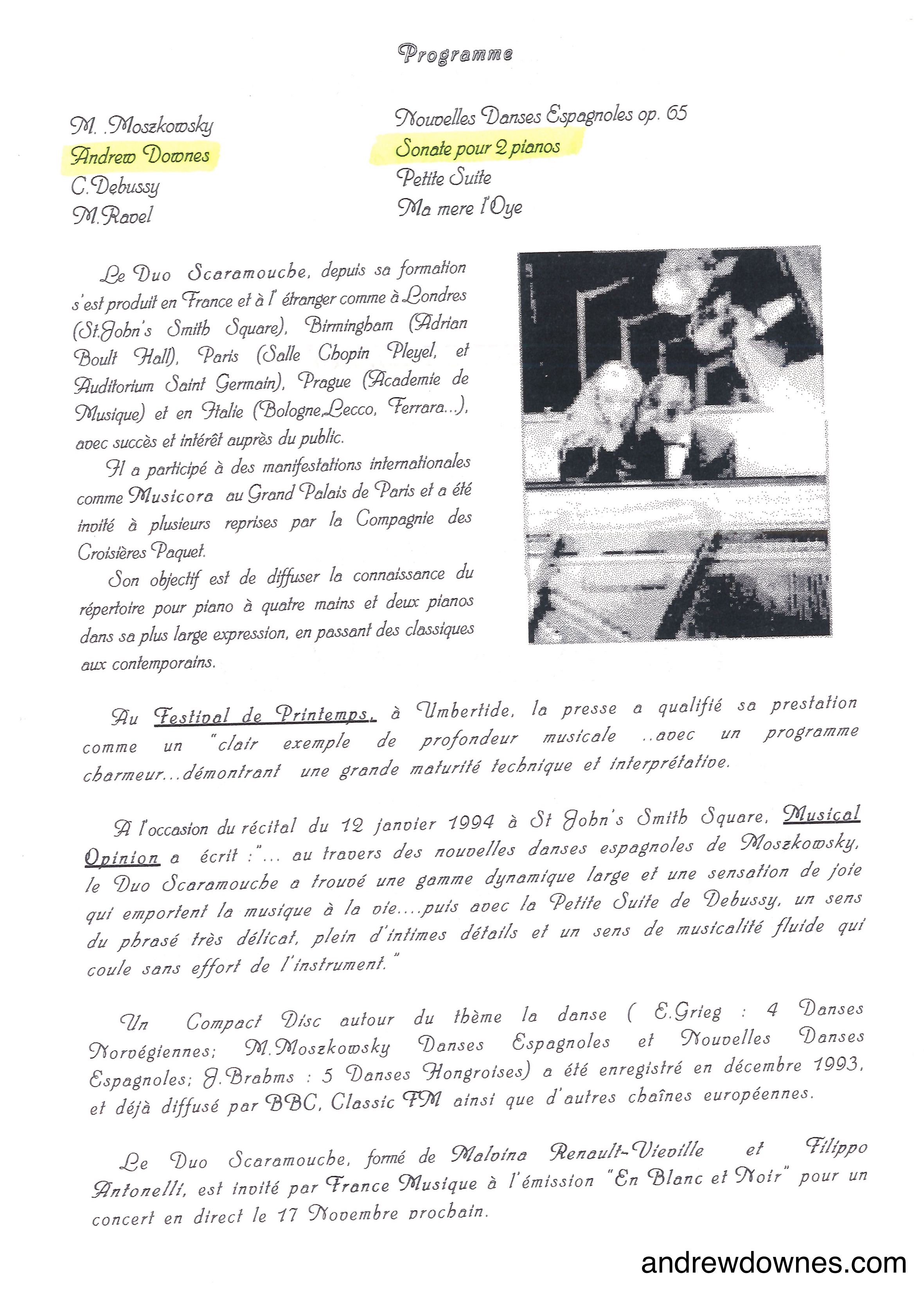 In the 1990s Andrew built up a liaison with the Parisian based Duo Scaramouche: Filippo Antonelli and Malvina Renault. They had first contacted Andrew with the hopes of forging links between their Ecole Franco-Italienne in Paris and Birmingham Conservatoire. I gave them copies of Andrew's Sonata for 2 Pianos, and they gave the first Parisian performance in the Salle des Arts in St Germain-en-Laye in October 1995.