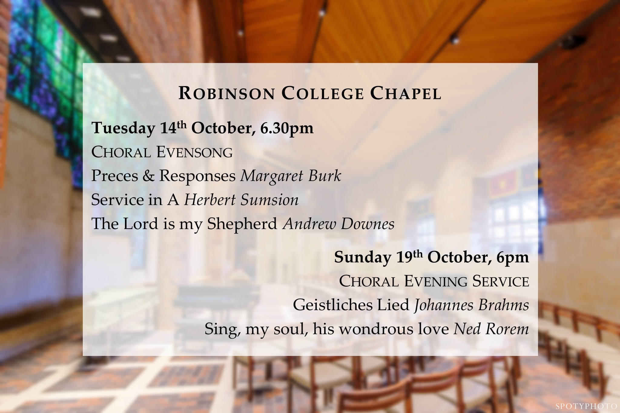 In 2025, our daughter Paula introduced the anthem to her fellow lay clerk at Ely Cathedral, Will Sims, who, as Director of the excellent Chapel Choir of Robinson College Cambridge, gave 2 performances of The Lord is My Shepherd in their Evensong services in the College Chapel in October of that year. Paula and I attended the first of these services. We loved the choir's monumental and passionate interpretation of the anthem.