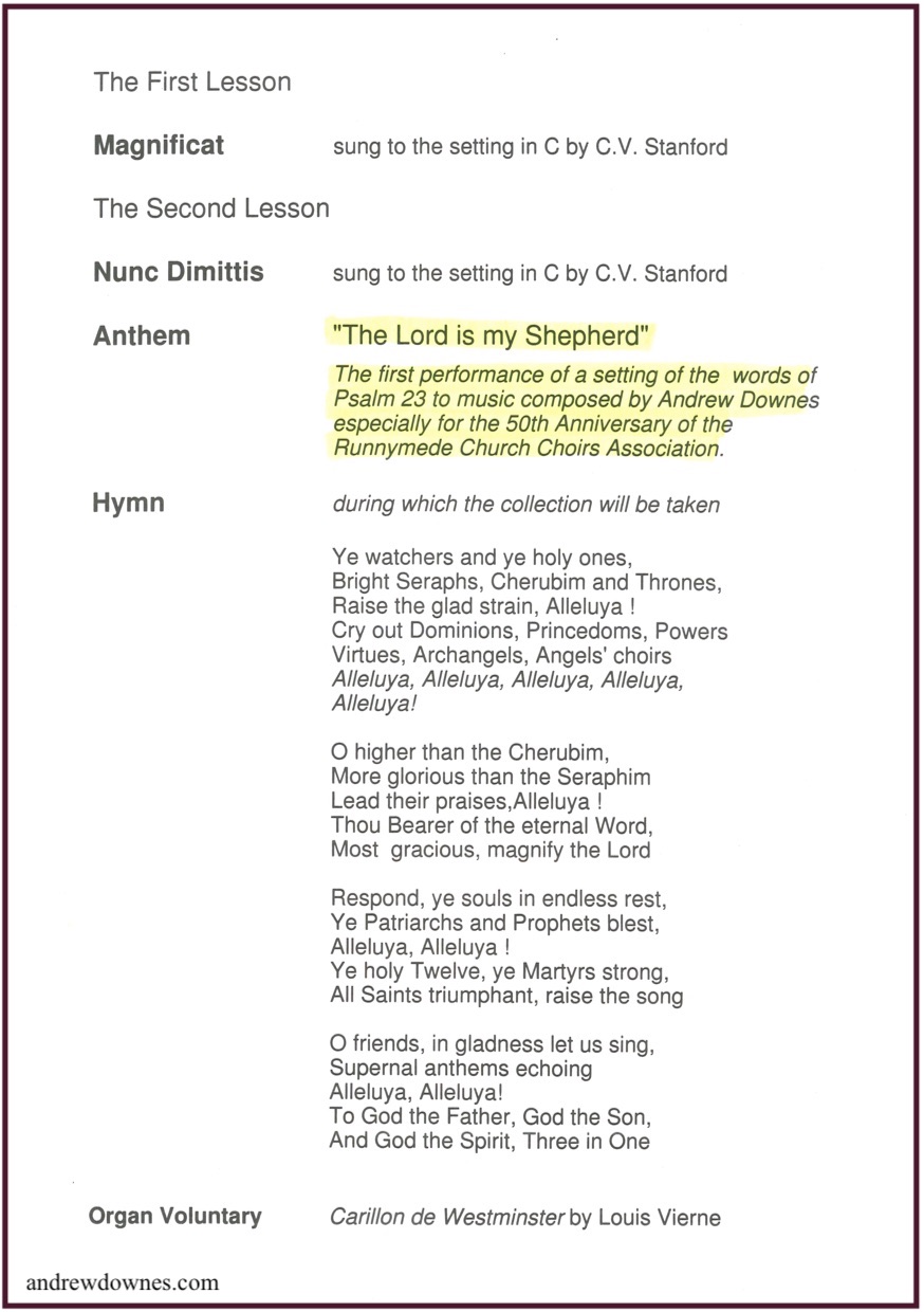 Following Andrew's devastating and untimely death in January 2023, as part of 'The Andrew Downes Year of Remembrance', a performance of The Lord is my Shepherd was given by the Wombourne & District Choral Society, directed by Edd Caine in Beckminster Church, Wolverhampton. Their performance was so heartfelt and sincere, that it brought tears to my eyes throughout.
