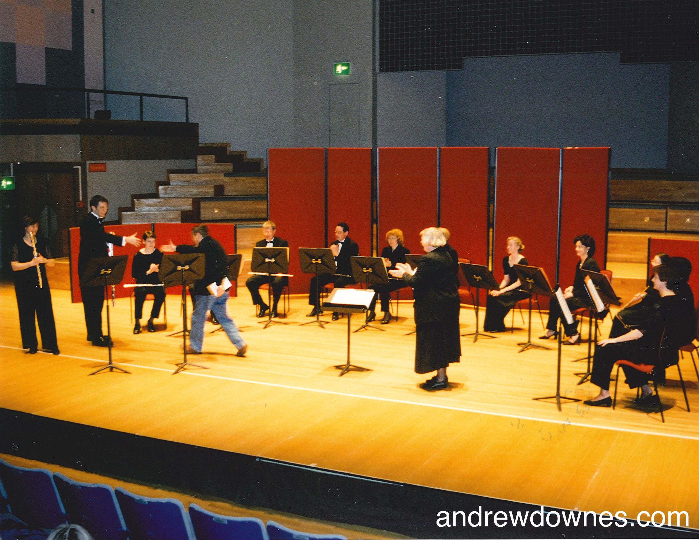 1st performance of Andrew Downes' Fantastia for Alto and Bass Flutes with 5 part Concert Flute Choir, 18/4/1999, evening, Adrian Boult Hall, Birmingham, Clare Southworth (alto flute), Gary Woolf (bass flute), The Birmingham Flute Ensemble