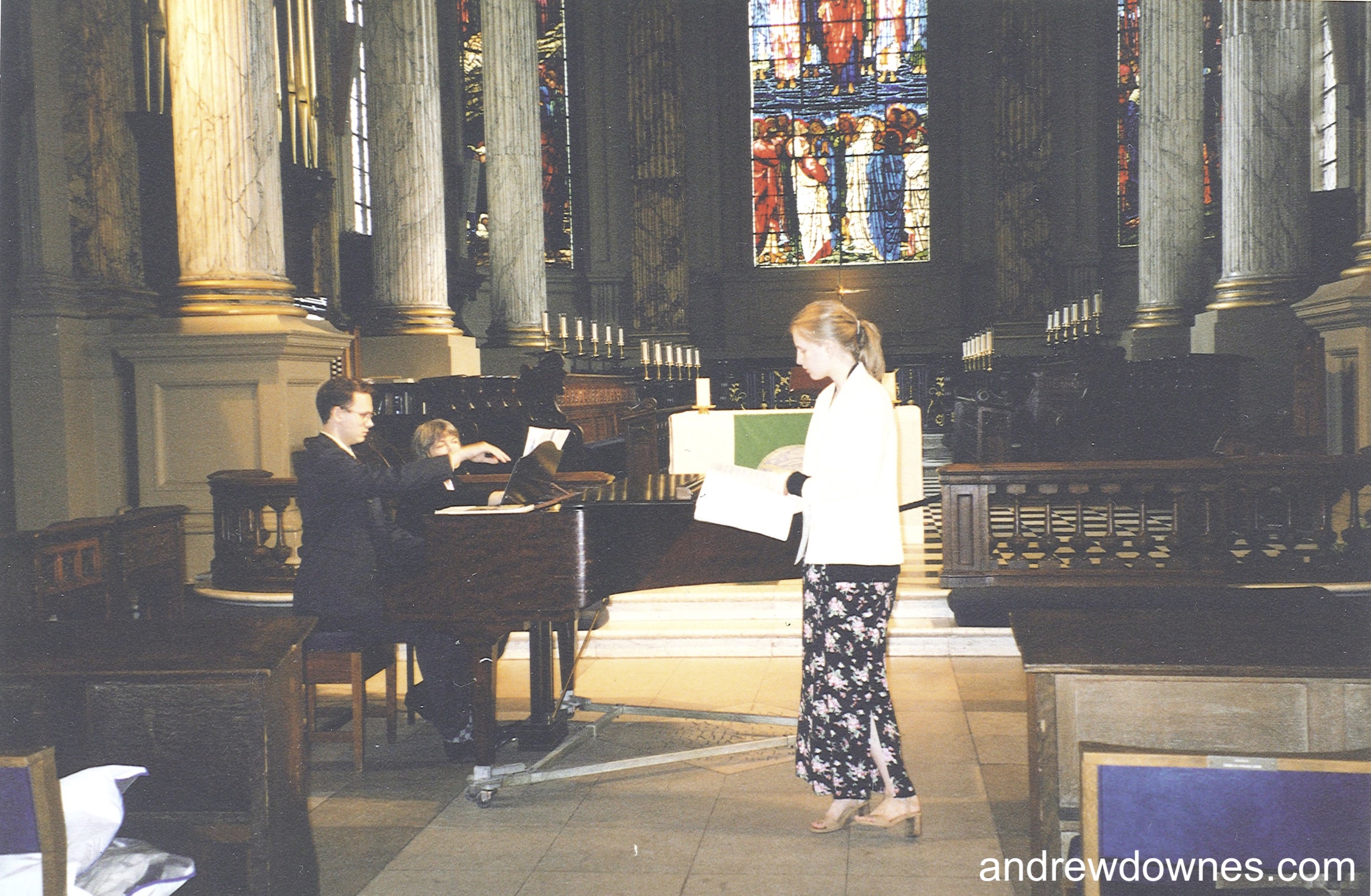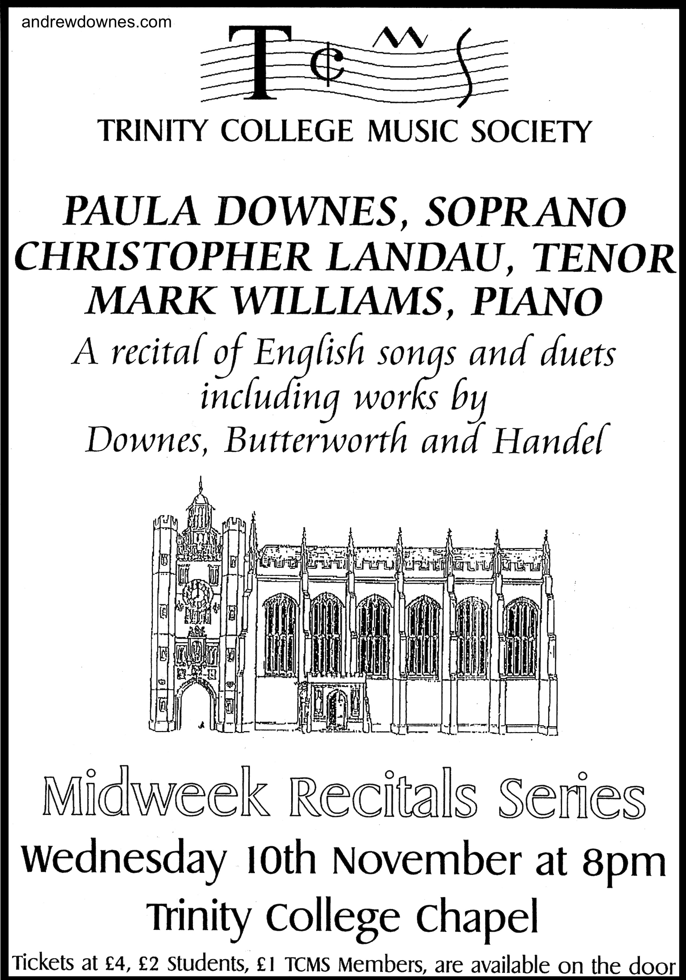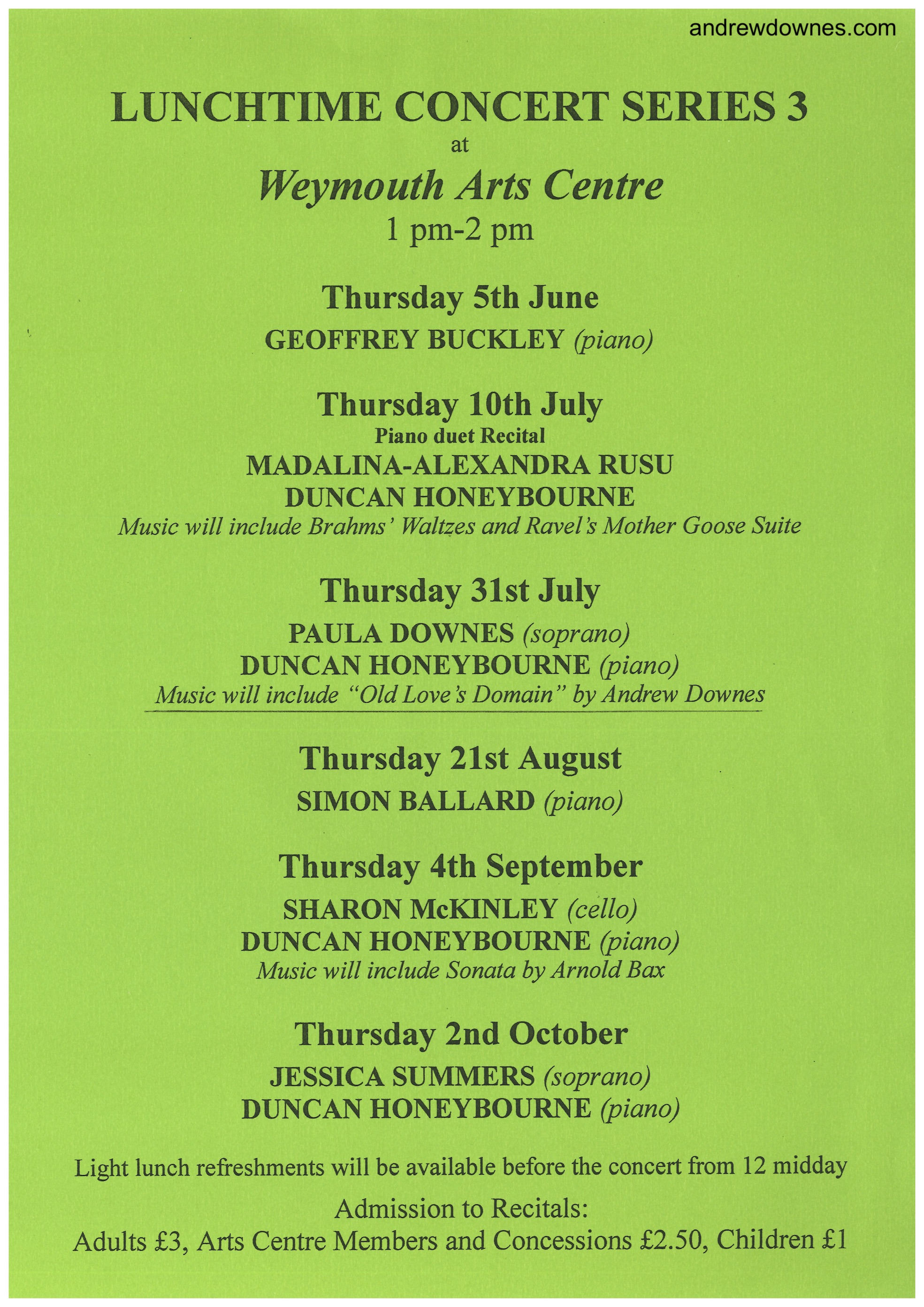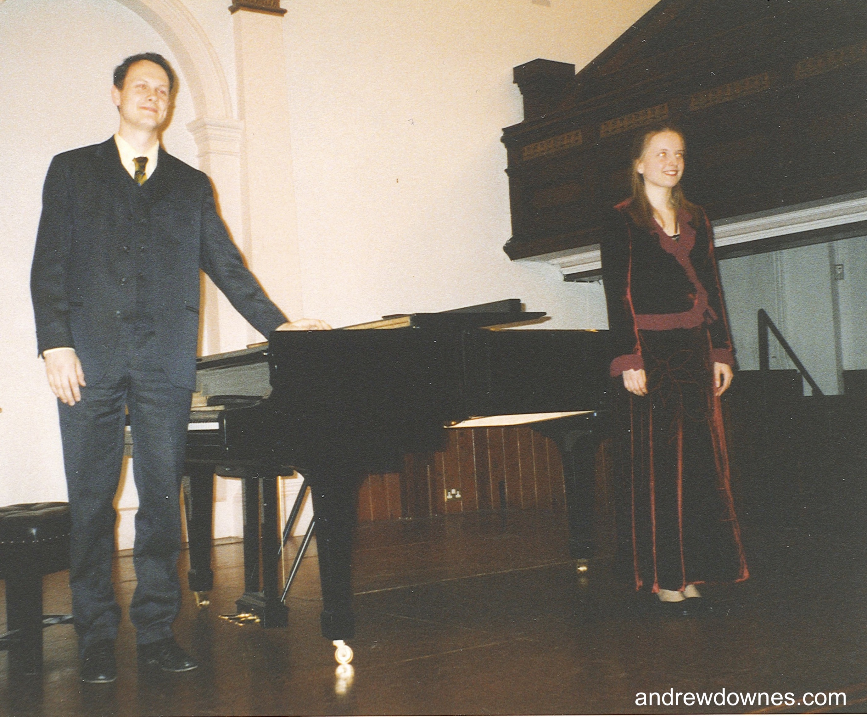 Our daughters, violinist Anna and soprano Paula Downes, have always championed their father's music.  Paula, accompanied respectively by Verene Rimlinger, Anna Downes, Mark Williams, Andrew Tortise, Heather Fairs, Nicholas Wright, Duncan Honeybourne, Gillian Cracknell and David Trippett, has given numerous performances of Old Love's Domain in Europe and the USA.  Paula gained a choral scholarship to Trinity College Cambridge in 1998 and performed Old Love's Domain on numerous occasions during her student years and beyond, both in Cambridge and elsewhere: at the Candili Singing Course, Greece (August 1999); St John's Church, Hagley (2 songs, September 1999); the Chapel of Trinity College, Cambridge (November 1999); the Bateman Auditorium of Gonville & Caius College, Cambridge (January 2000); the Master's Lodge of Trinity College, Cambridge, (2 songs, February 2000); the Fitzwilliam Museum, Cambridge (May 2001); Chateau Impney, Droitwich, Worcestershire (2 songs, July 2001); Birmingham Cathedral (July 2002); Hanley Swan Church, Worcestershire (2 songs, October 2002); the ‘Festival Musiques en Mer’ Mediterranean Cruise (August 2002); Y Tabernacl, Machynlleth (April 2003); Weymouth Music Club (July 2003); Kidderminster Town Hall (final song, September 2003); the Art Gallery, Wednesbury (April 2004); St Sepulchre's Church, Holborn, London (February 2005).