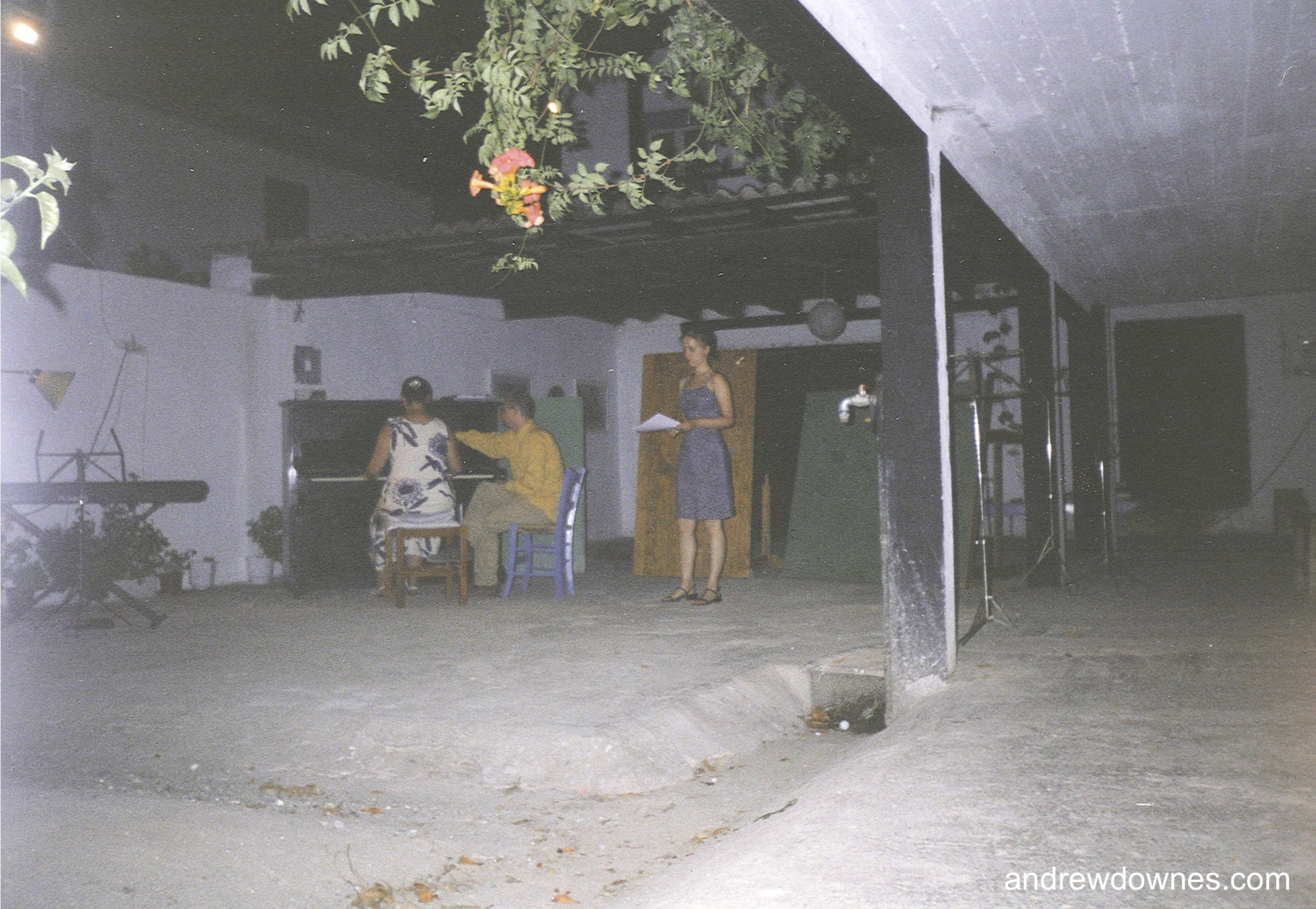 Paula Downes rehearsing "The curtains now are drawn" from Andrew Downes' Old Love's Domain, accompanied by Verene Rimlinger at Michael Chance's Candilli Singing Course in Greece, 1999.