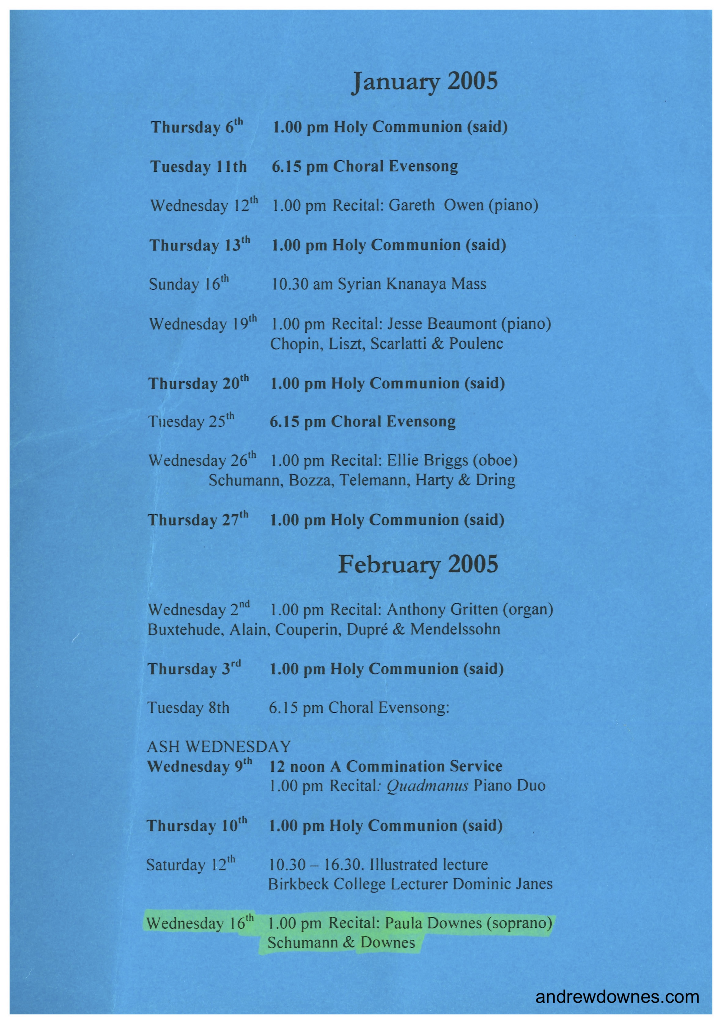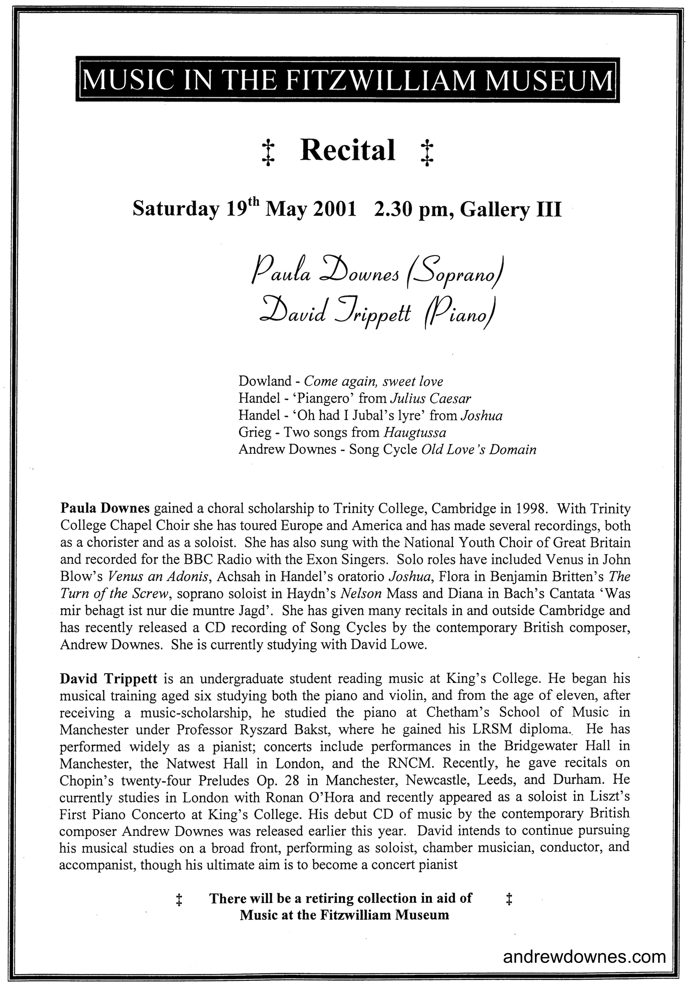 In 2005 Paula married David Trippett and both became Pastoral Tutors at Harvard University during David's time as a post graduate student of Music there.  Accompanied by her husband, Paula continued to include Andrew's music in her recitals.  She and David performed Old Love's Domain in the Church of St John the Evangelist, Bowdain Street, Boston, Massachussets, USA, in September 2008.  Back in England they gave performances of the cycle at Bristol Music Club in February 2014 and then in the Church of St Mary Magdalene, Munster Square, London, as part of the Markson's Pianos Concert Series in September 2017.  Andrew and I both enjoyed going to a number of these performances in the UK and the USA.  For the London concert, we looked after Paula and David's little daughters during it!