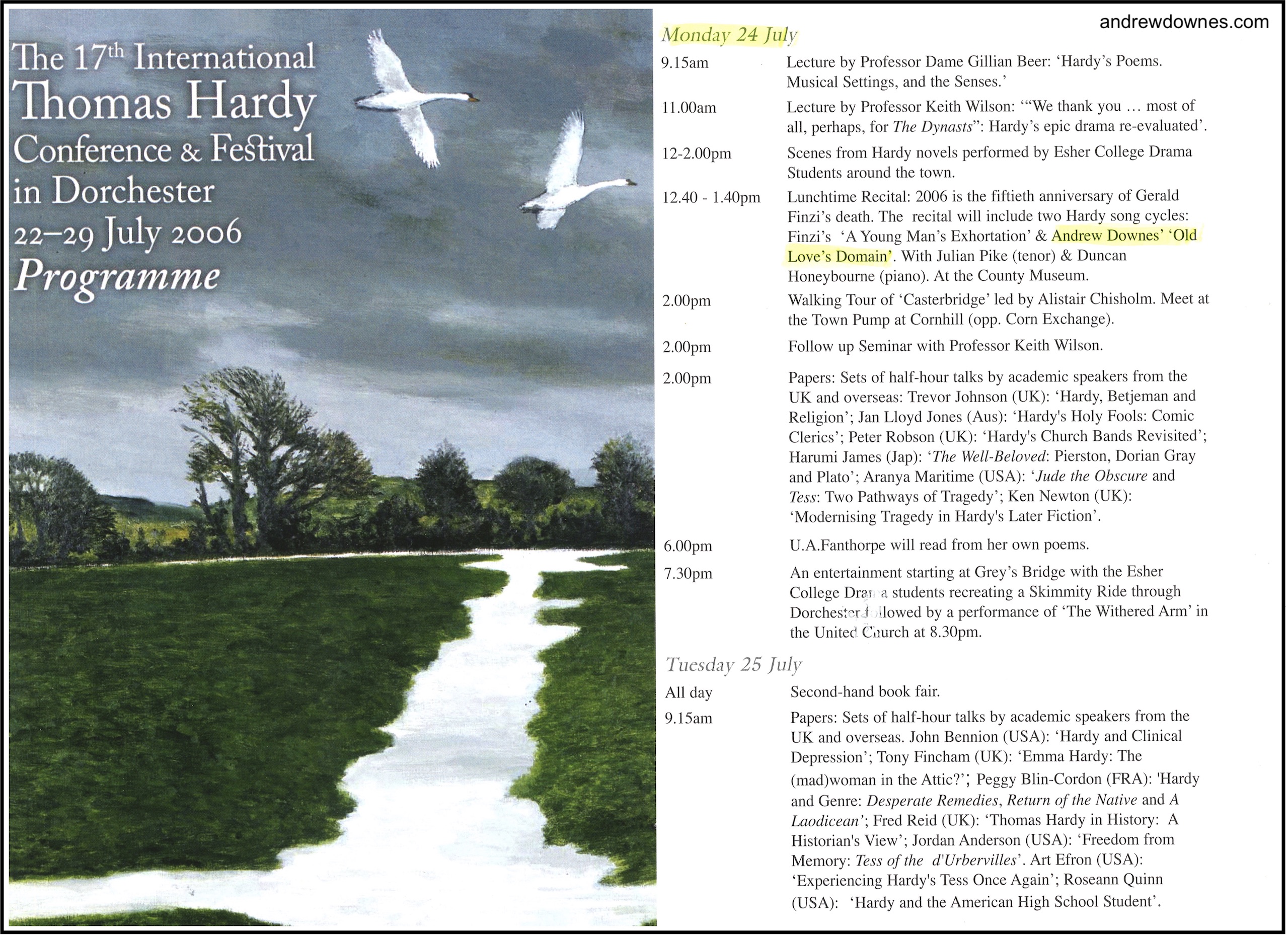 In a concert of music by Andrew Downes on June 21st 2005, in the Adrian Boult Hall, Birmingham (to mark Andrew's retirement from Birmingham Conservatoire), the cycle was given a stunning, intensely dramatic performance by tenor Julian Pike with accompanist Simon Nicholls.  Julian Pike, accompanied by Duncan Honeybourne, then performed the cycle at the 2006 Thomas Hardy Festival in Dorchester, Dorset.