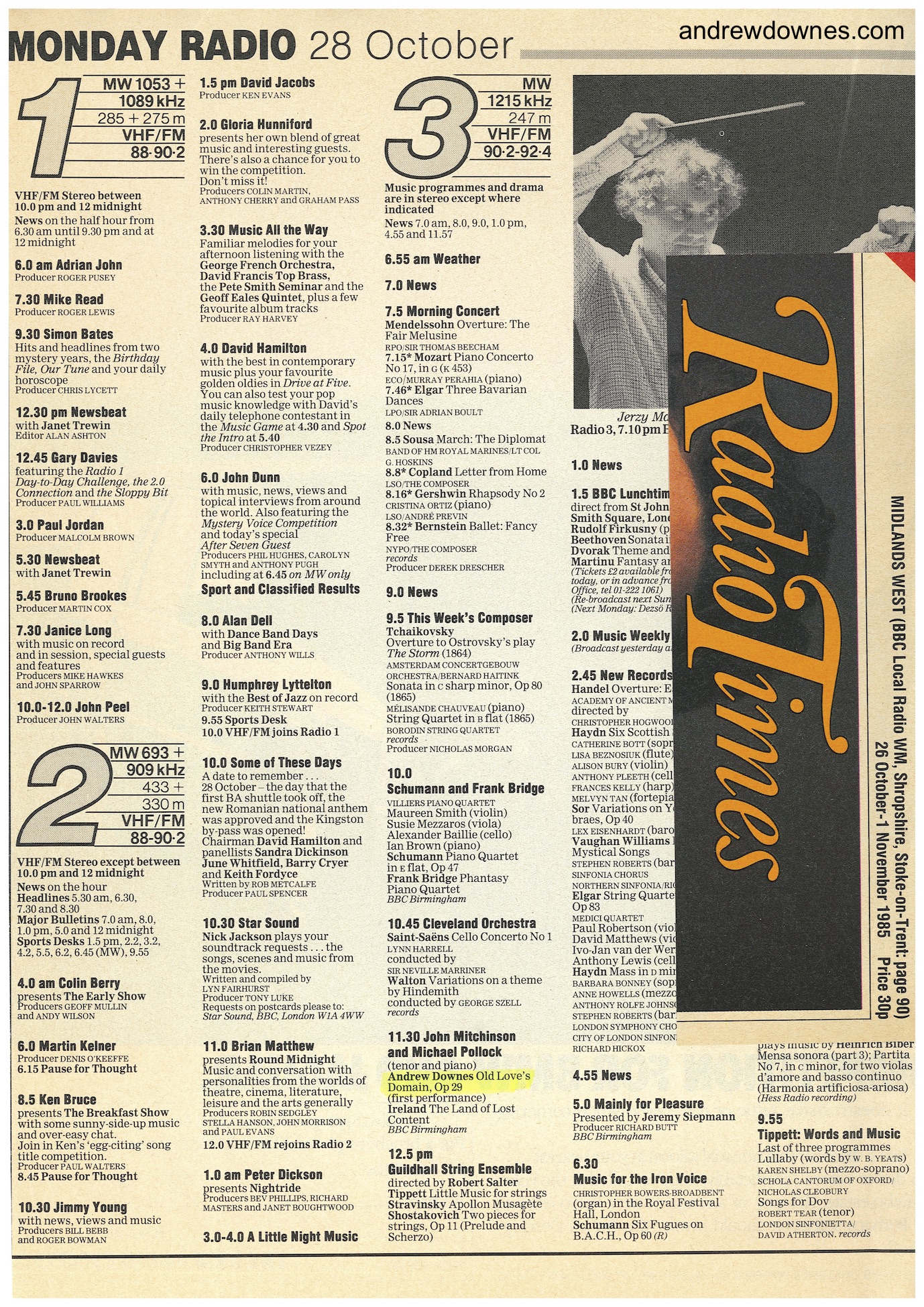 Andrew was even more excited when John Mitchinson, accompanied by pianist Michael Pollock, recorded the songs for BBC Radio 3 on 4th June 1985 at the BBC Pebble Mill studios in Birmingham.  This first performance was broadcast on BBC Radio 3 on 28th October 1985.  To our immense delight, John Mitchinson, with Michael Pollock, gave subsequent performances on Radio 3, and with Mark Racz he performed the cycle in the Adrian Boult Hall, Birmingham, in December 1987.