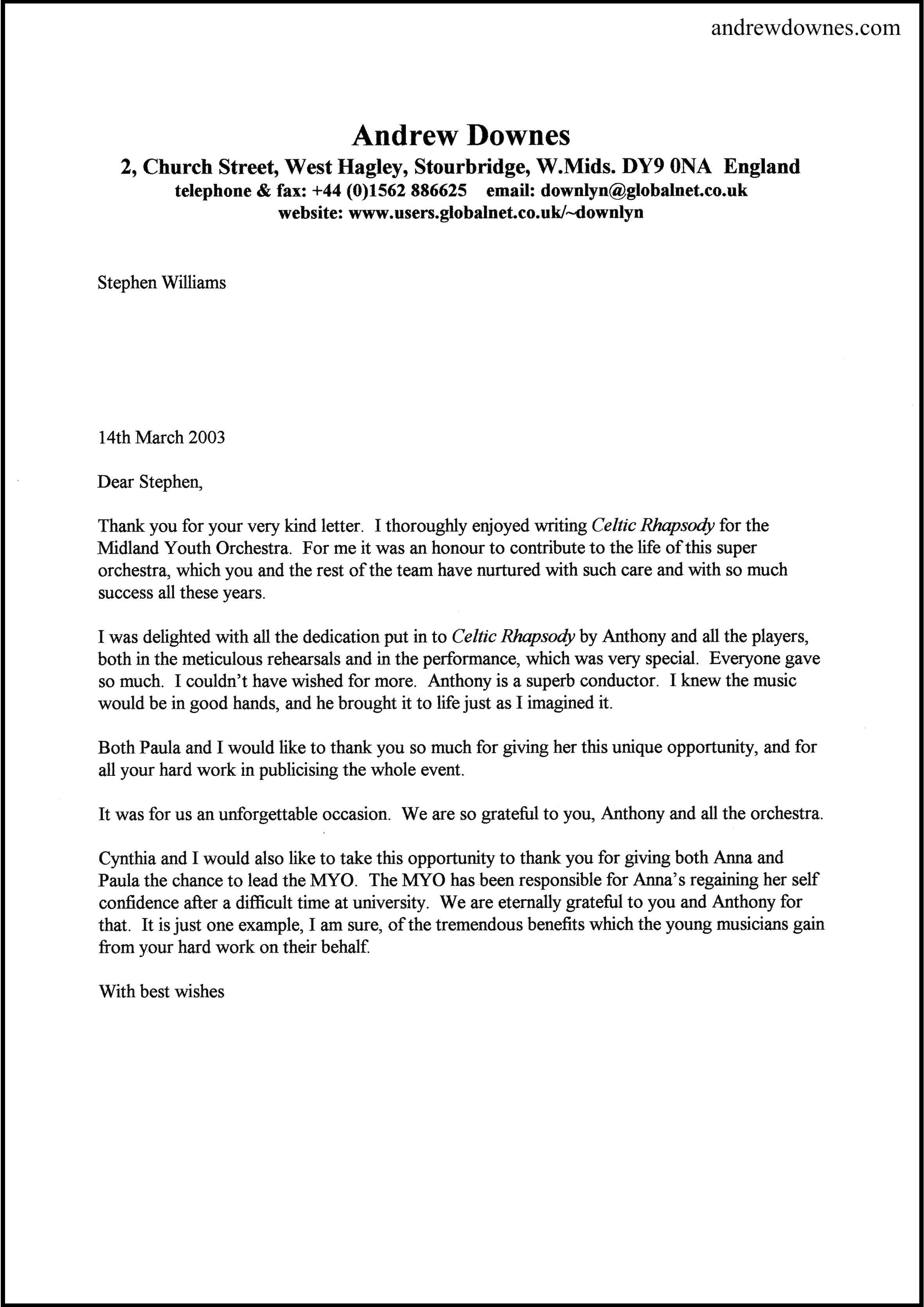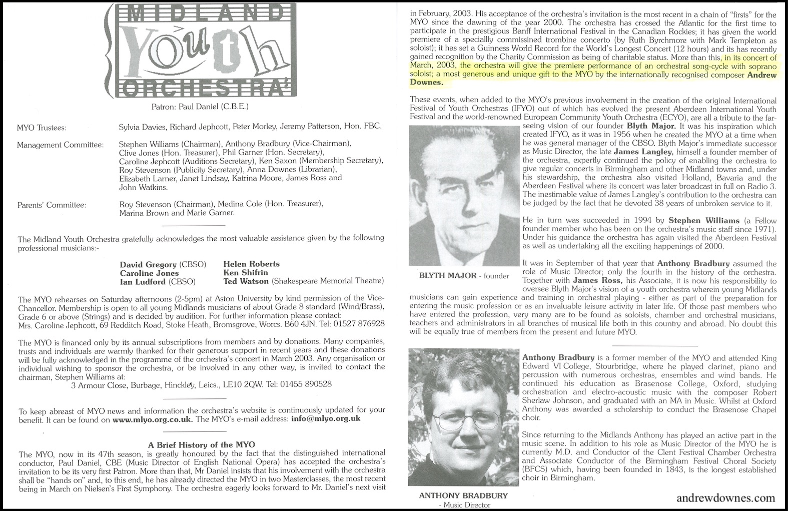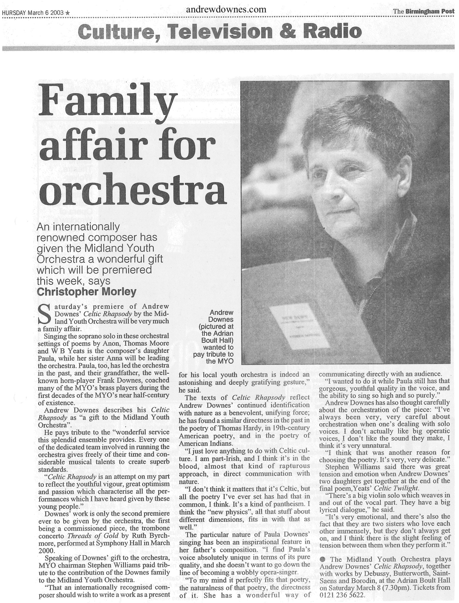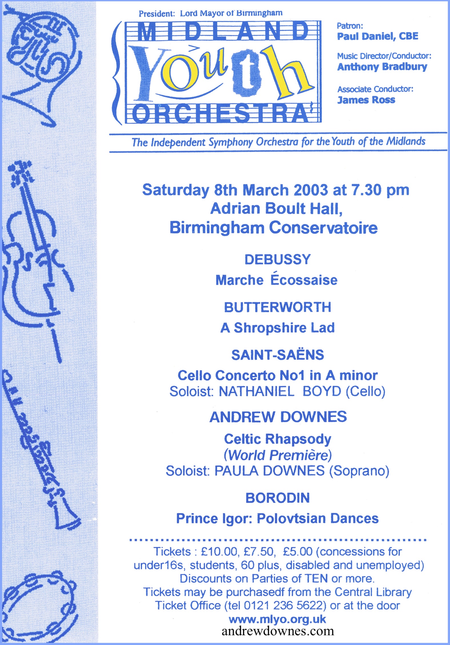 'That an internationally recognised composer should wish to write a work as a present for his local youth orchestra is indeed an astonishing and deeply gratifying gesture... In fact the connections between the Downes family and the MYO go back to the very beginnings of this orchestra... Frank Downes, father of Andrew... was the inspiration behind many of the MYO's early horn sections... Frank... taught horn-playing to so many of those players covering, perhaps, the first 20 years of the orchestra's history... Then, some 4 decades later, Frank's two granddaughters Paula and Anna both became violinists in the MYO. Each has had the opportunity to be leader of the orchestra, both very much on merit, and Anna (the current leader) has also been able to make an invaluable contribution to the health and well-being of the orchestra behind the scenes... Andrew, father of Anna and Paula, has been moved to give to the orchestra still more by composing Celtic Rhapsody for Soprano and Orchestra specially for it. His Celtic Rhapsody now links three generations of the Downes family to the Midland Youth Orchestra... It will be a great honour for all involved this evening that, with Paula, the orchestra will bring its own work to life for the very first time. Andrew, on behalf of the MYO, I give you my heartfelt thanks.' - Programme tribute from Stephen Williams, Chairman of the Midland Youth Orchestra.