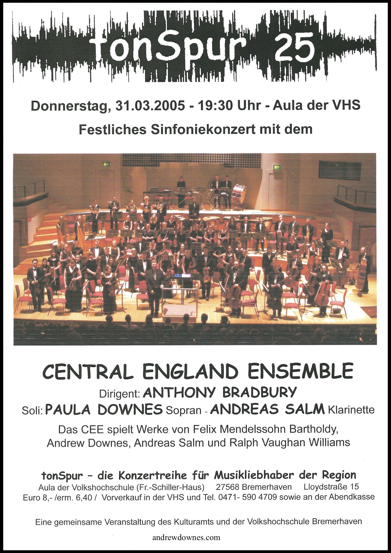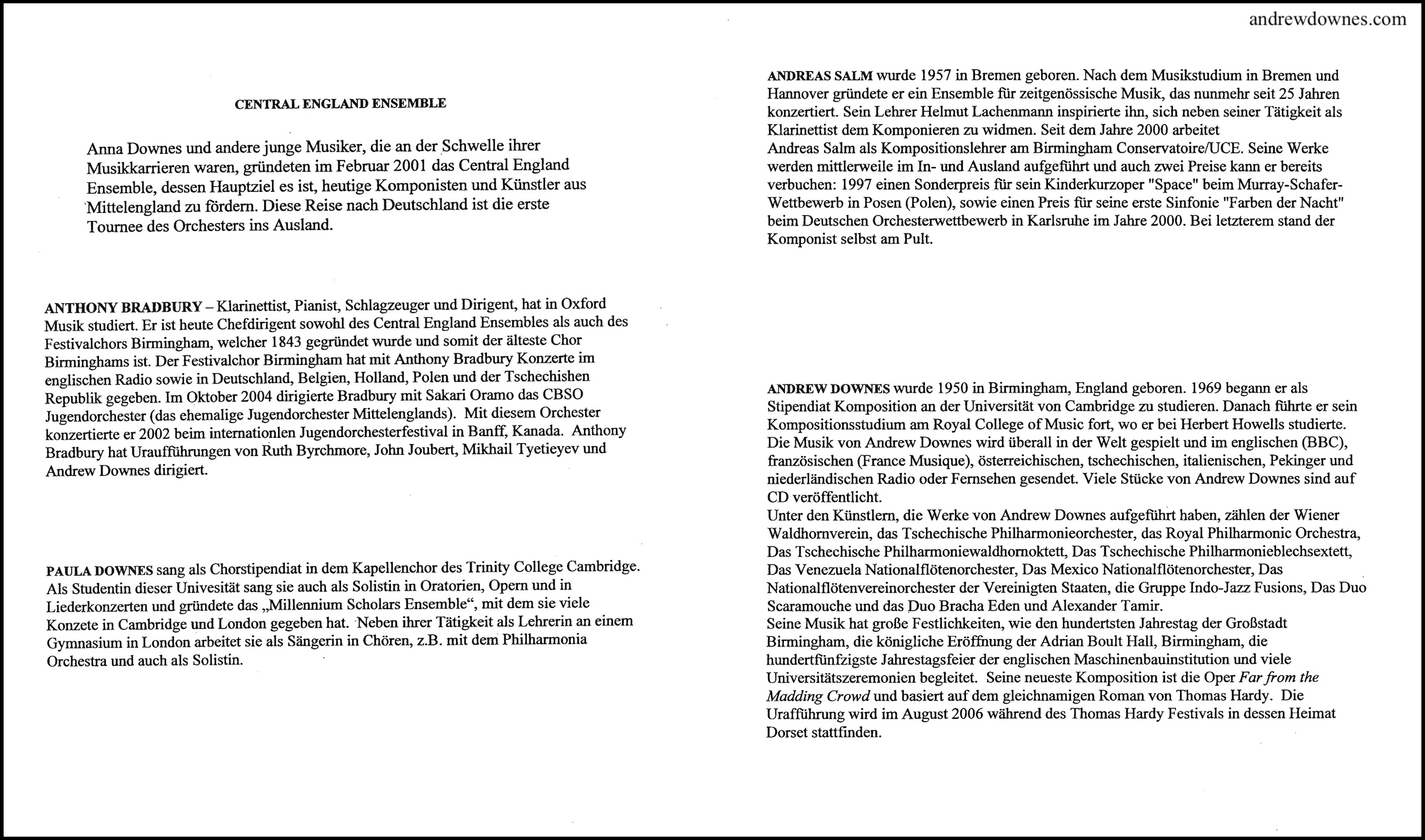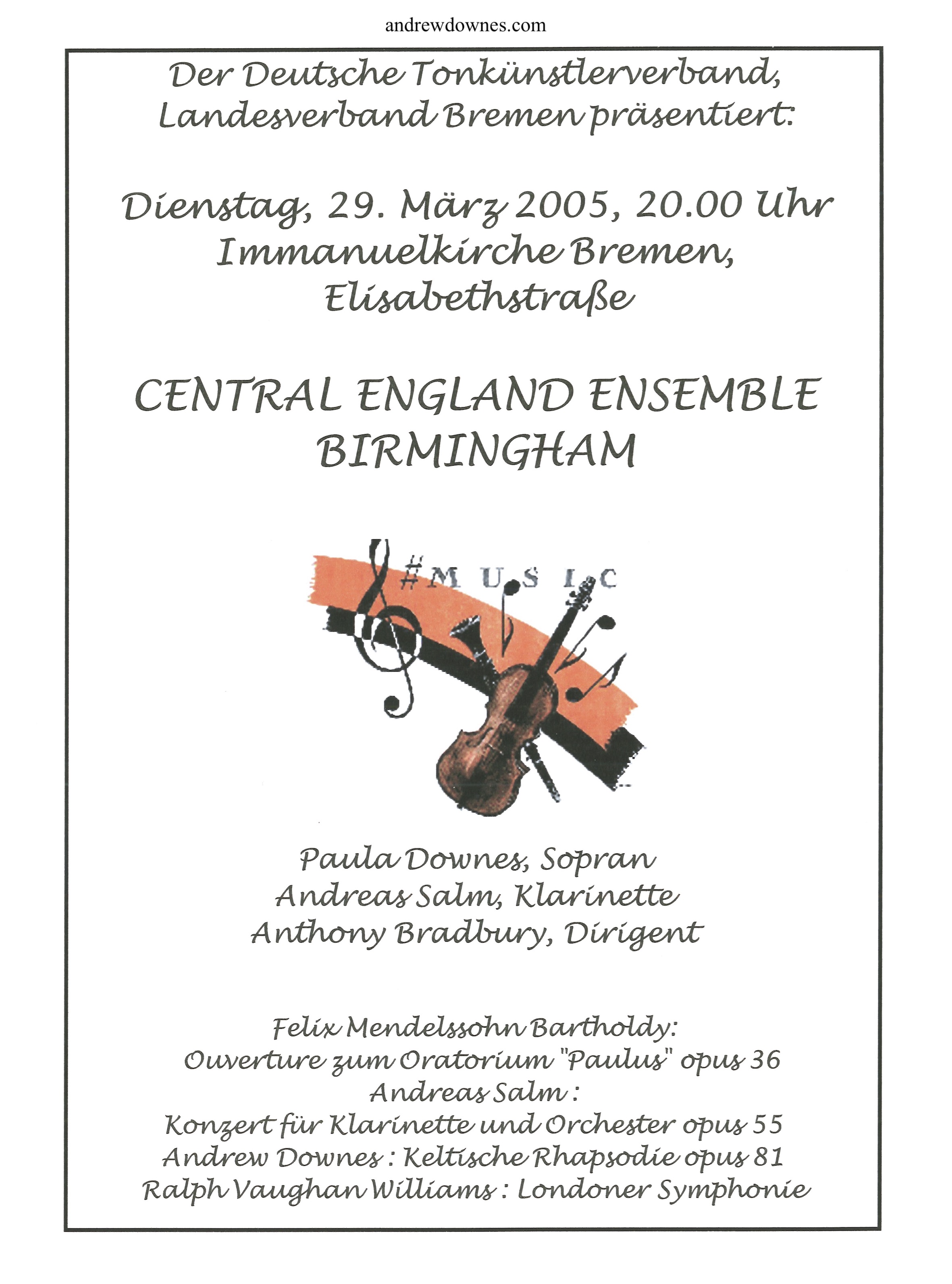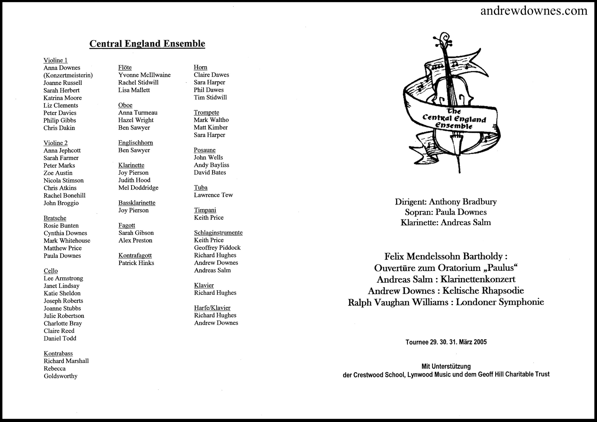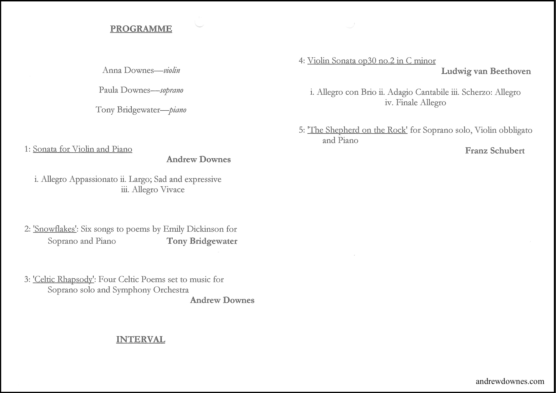 'That an internationally recognised composer should wish to write a work as a present for his local youth orchestra is indeed an astonishing and deeply gratifying gesture... In fact the connections between the Downes family and the MYO go back to the very beginnings of this orchestra... Frank Downes, father of Andrew... was the inspiration behind many of the MYO's early horn sections... Frank... taught horn-playing to so many of those players covering, perhaps, the first 20 years of the orchestra's history... Then, some 4 decades later, Frank's two granddaughters Paula and Anna both became violinists in the MYO. Each has had the opportunity to be leader of the orchestra, both very much on merit, and Anna (the current leader) has also been able to make an invaluable contribution to the health and well-being of the orchestra behind the scenes... Andrew, father of Anna and Paula, has been moved to give to the orchestra still more by composing Celtic Rhapsody for Soprano and Orchestra specially for it. His Celtic Rhapsody now links three generations of the Downes family to the Midland Youth Orchestra... It will be a great honour for all involved this evening that, with Paula, the orchestra will bring its own work to life for the very first time. Andrew, on behalf of the MYO, I give you my heartfelt thanks.' - Programme tribute from Stephen Williams, Chairman of the Midland Youth Orchestra.