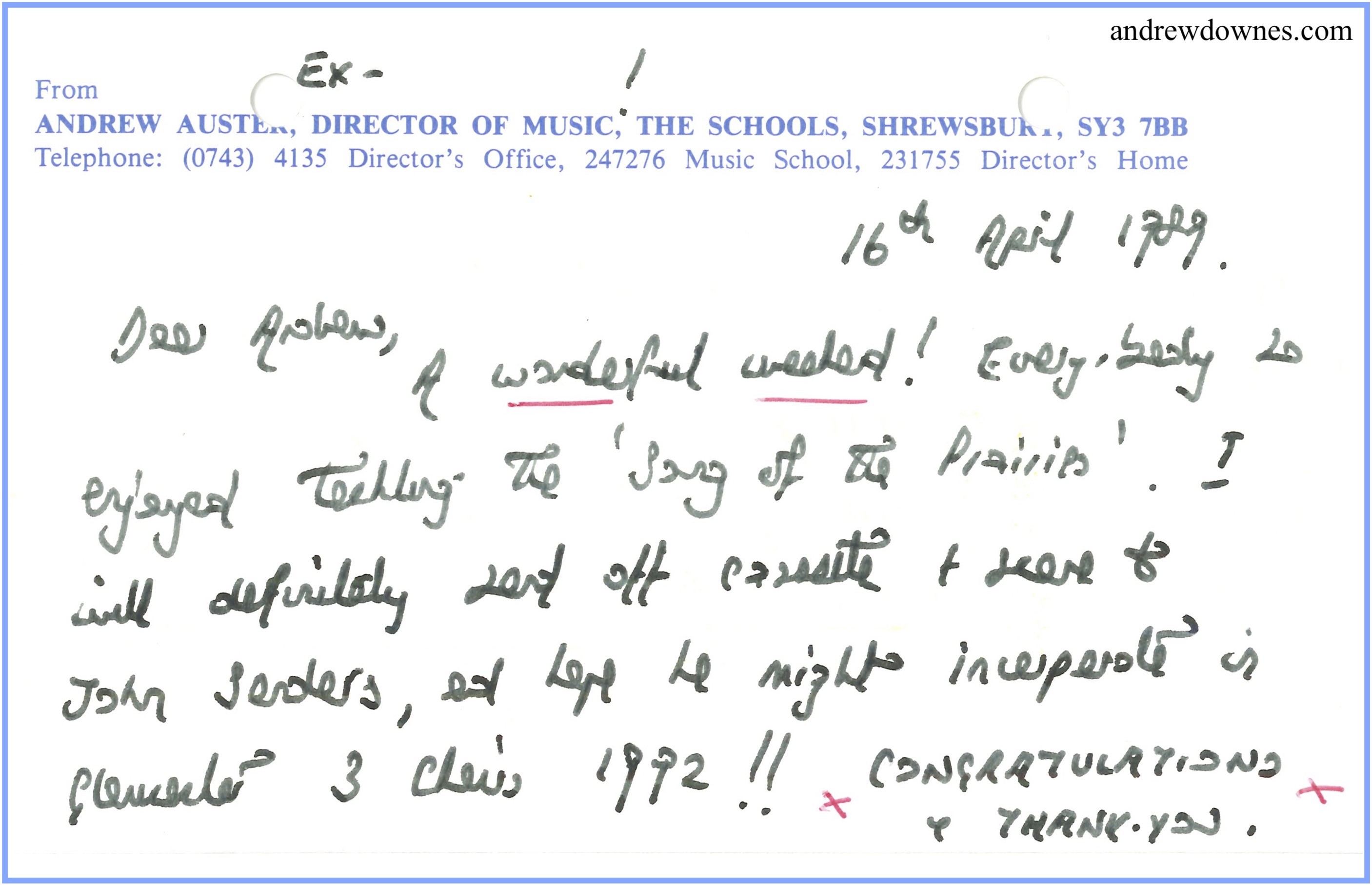 Shrewsbury Public School used to hold an annual Singing Weekend. Andrew was absolutely thrilled when Andrew Auster, Head of Music at the School, asked him to compose a work for the Sixth Singing Weekend in 1988. Andrew had at his disposal 4 vocal soloists, a massed choir from all parts of the UK, the famous Cantamus Girls’ Choir and the Birmingham School of Music (now Royal Birmingham Conservatoire) Symphony Orchestra. The icing on the cake was to be the highly distinguished conductor, John Rutter.