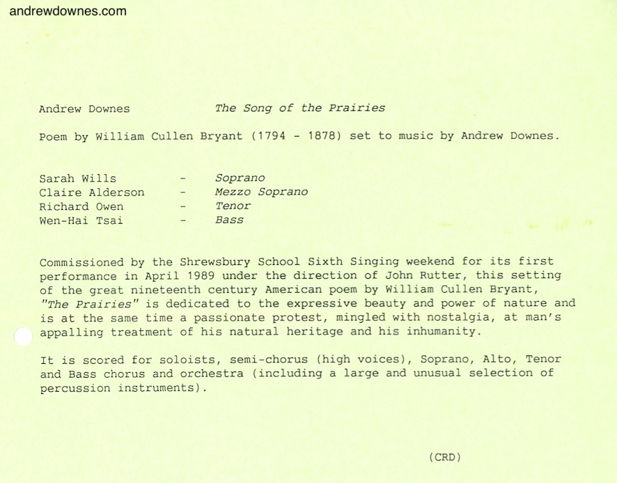 Andrew chose as his text for his large-scale choral work, The Prairies, by the American poet, William Cullen Bryant (1794-1878). As Andrew set this inspiring verse to music, I knew he was composing a masterpiece.