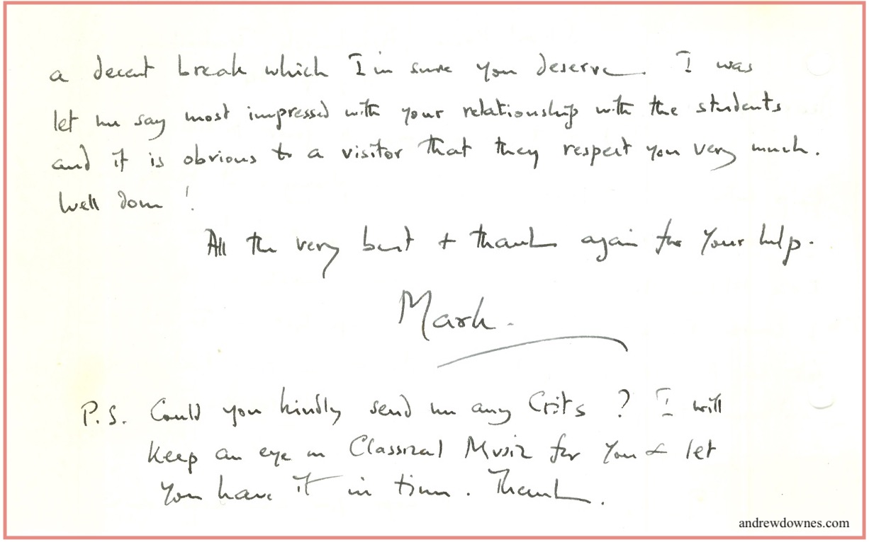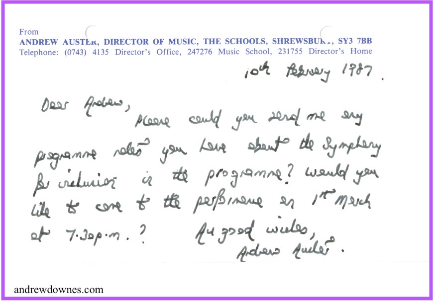 Correspondence with Andrew Auster, Director of Music at Shrewsbury School: