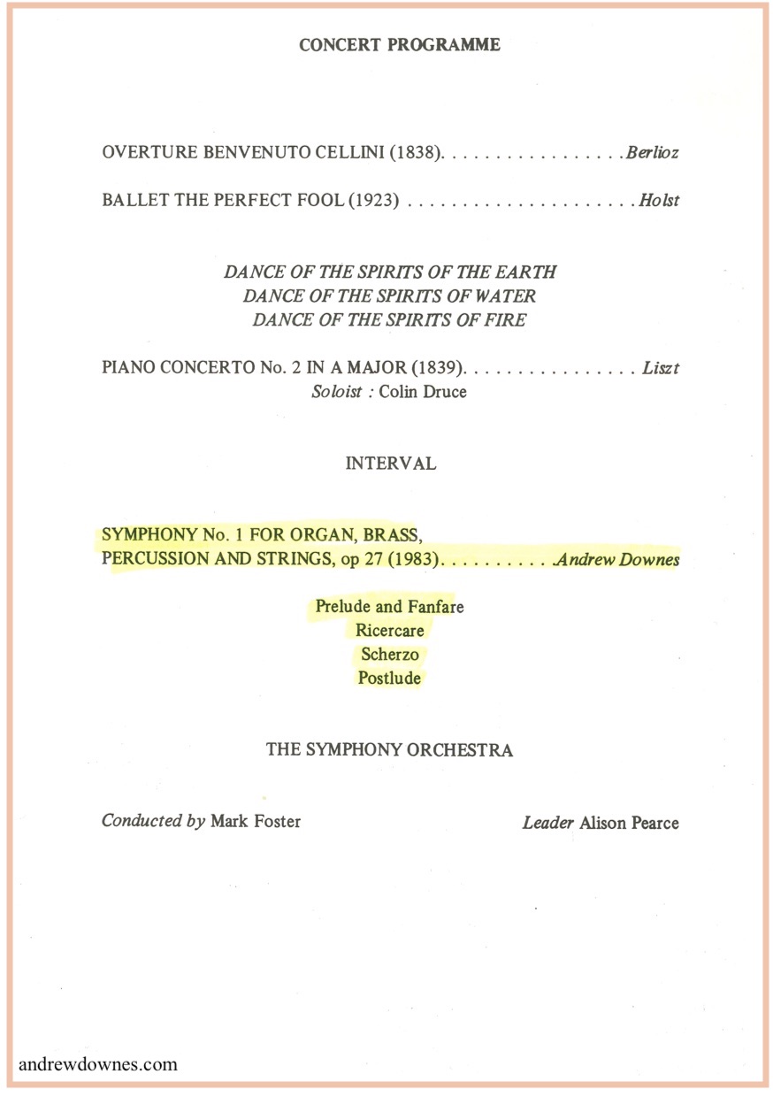 The dynamic first performance of Symphony No.1 was given by the Birmingham School of Music (now known as the Royal Birmingham Conservatoire) Symphony Orchestra, with Michael Haynes, organ, conducted by Mark Foster, on 11th July 1984 in All Saints Church, Cheltenham, as part of the Cheltenham Festival Fringe, in a concert to commemorate the 50th anniversary of the death of Gustav Holst, former organist at the church.