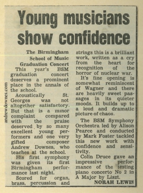 Andrew wrote his first symphony in the early 1980s. At the time he, with many other people, was preoccupied with the fear of nuclear war. This coloured his composing to the extent that the symphony is full of foreboding and drama. He chose to use organ instead of woodwind, which added starkness to the sound world.