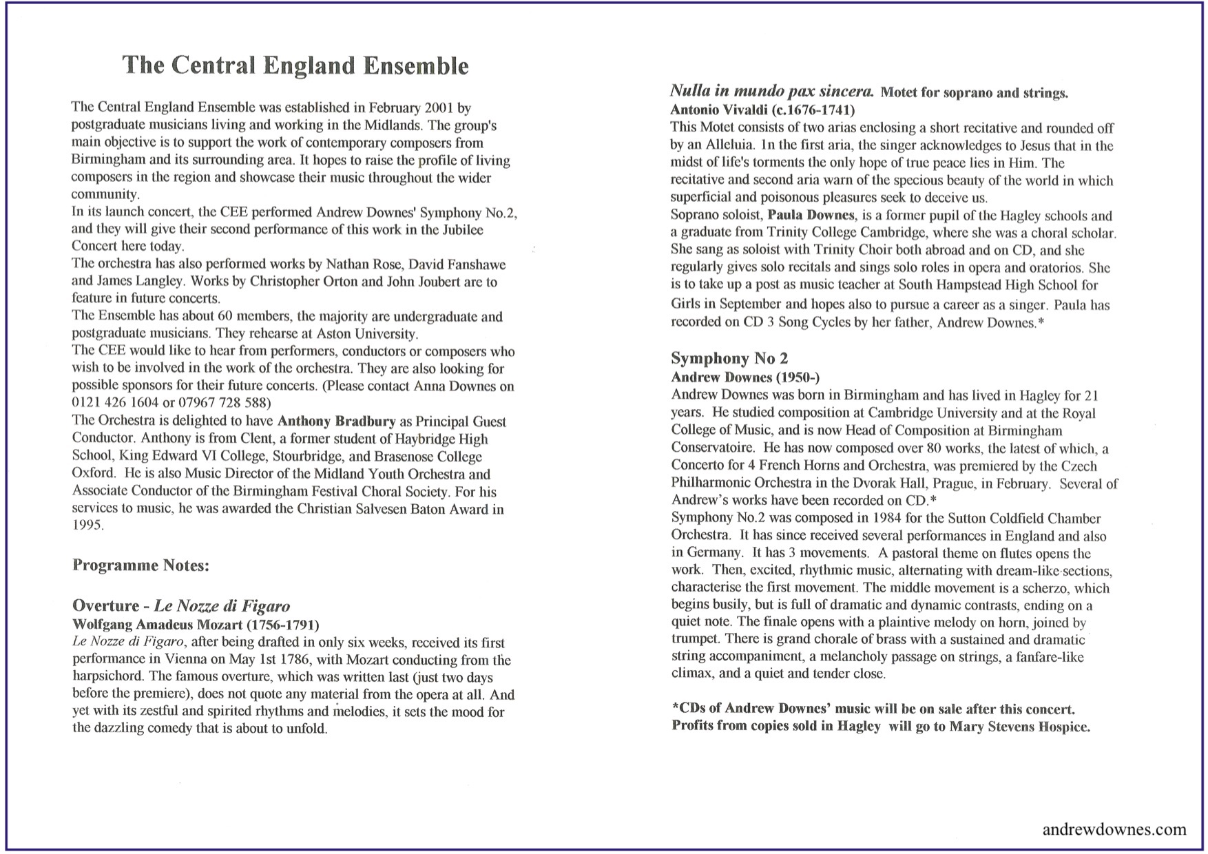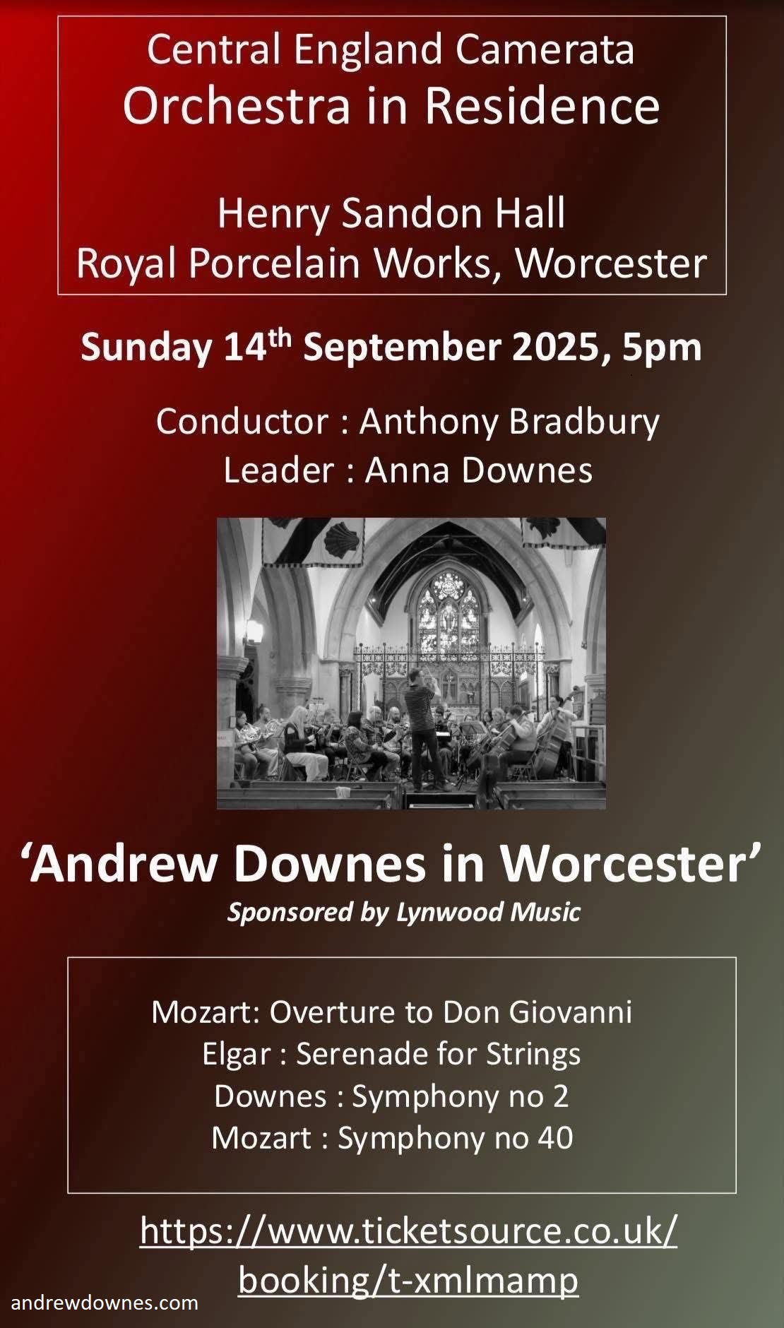 In September 2025, our daughter Anna's Central England Camerata, directed by Anthony Bradbury, gave a further extremely moving performance of Symphony No.2 in the Henry Sandon Hall of Worcester Porcelain, as part of their "Andrew Downes in Worcester" concert series, set up by Anna, who had gained for the orchestra the role of "Musicians in Residence" at the venue. The orchestra played the Symphony with amazing warmth and dedication.