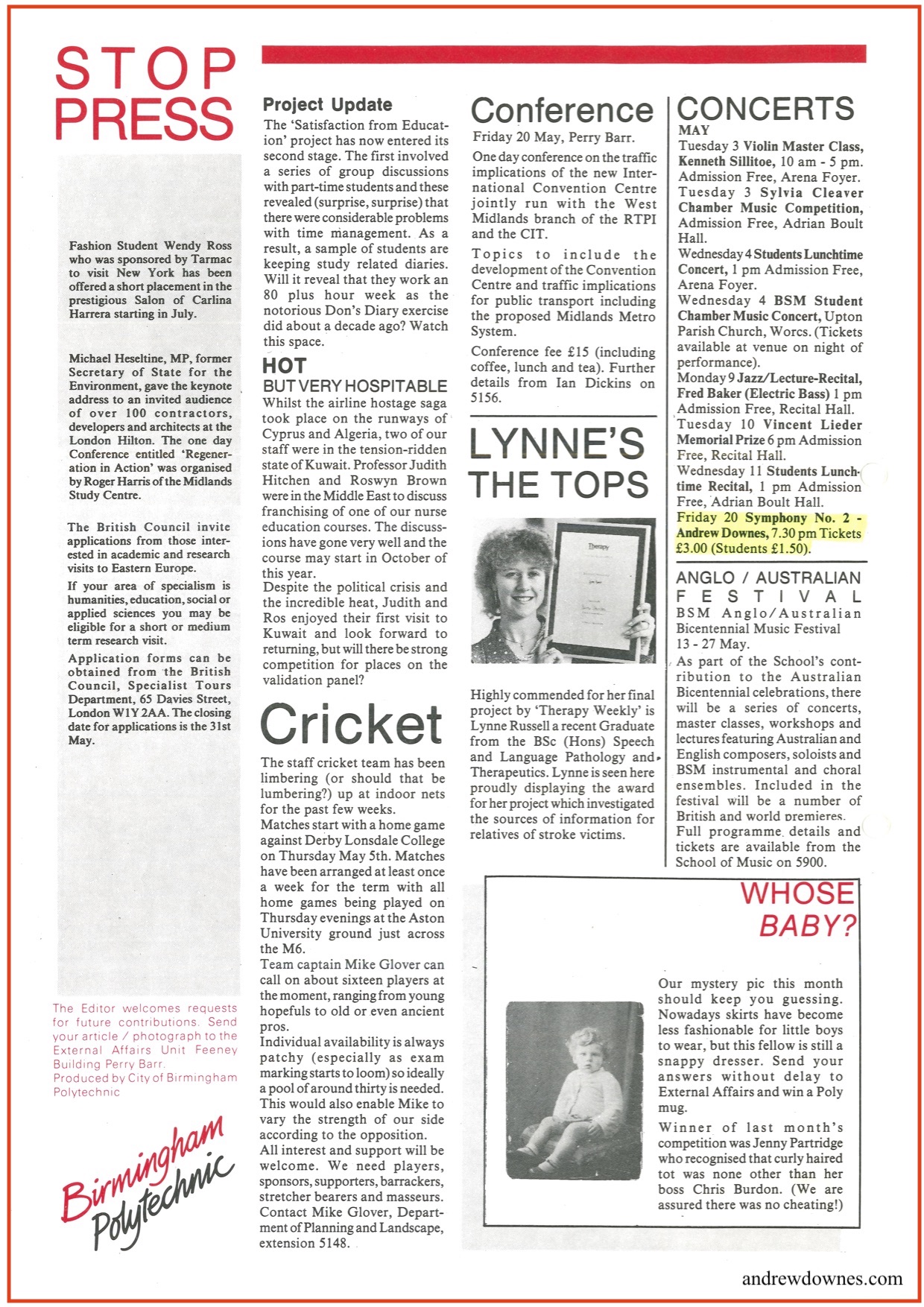 Andrew had a Chinese student at around this time, Fa Fa Jin, whose father was the conductor of the China Film Philharmonic Orchestra. Fa Fa was keen for his father to hear Andrew’s compositions and asked us to send scores and parts of Andrew’s orchestral music which had good recordings. The address was all in Chinese, so I stuck it firmly on the large box of music which I took to the post office. The post office worker in Hagley at the time was rather unpleasant. He impatiently refused to take the parcel when I asked to insure it, because of the difficulty in reproducing the address on the forms. I had to carry the heavy box back home (in tears!) and create small photocopies of the address to stick on the forms. My efforts were worthwhile however: the recording of Symphony No 2 was broadcast on Central Peking Radio four times in September and October 1990. It has also been broadcast many times on Musicians Page Radio, Los Angeles, USA, where I also sent recordings.