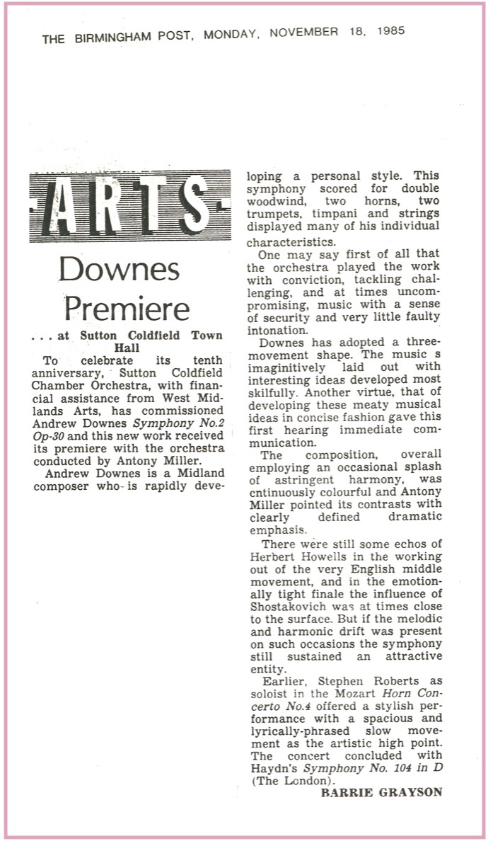 A colleague of Andrew’s at the Birmingham School of Music (now known as the Royal Birmingham Conservatoire), oboist Anthony Miller, also conducted the Sutton Coldfield Chamber Orchestra, who in 1985 were about to celebrate their tenth anniversary. Tony asked Andrew for a work for the Orchestra’s celebratory concert and Andrew took the opportunity to create his Symphony No.2 for Chamber Orchestra.