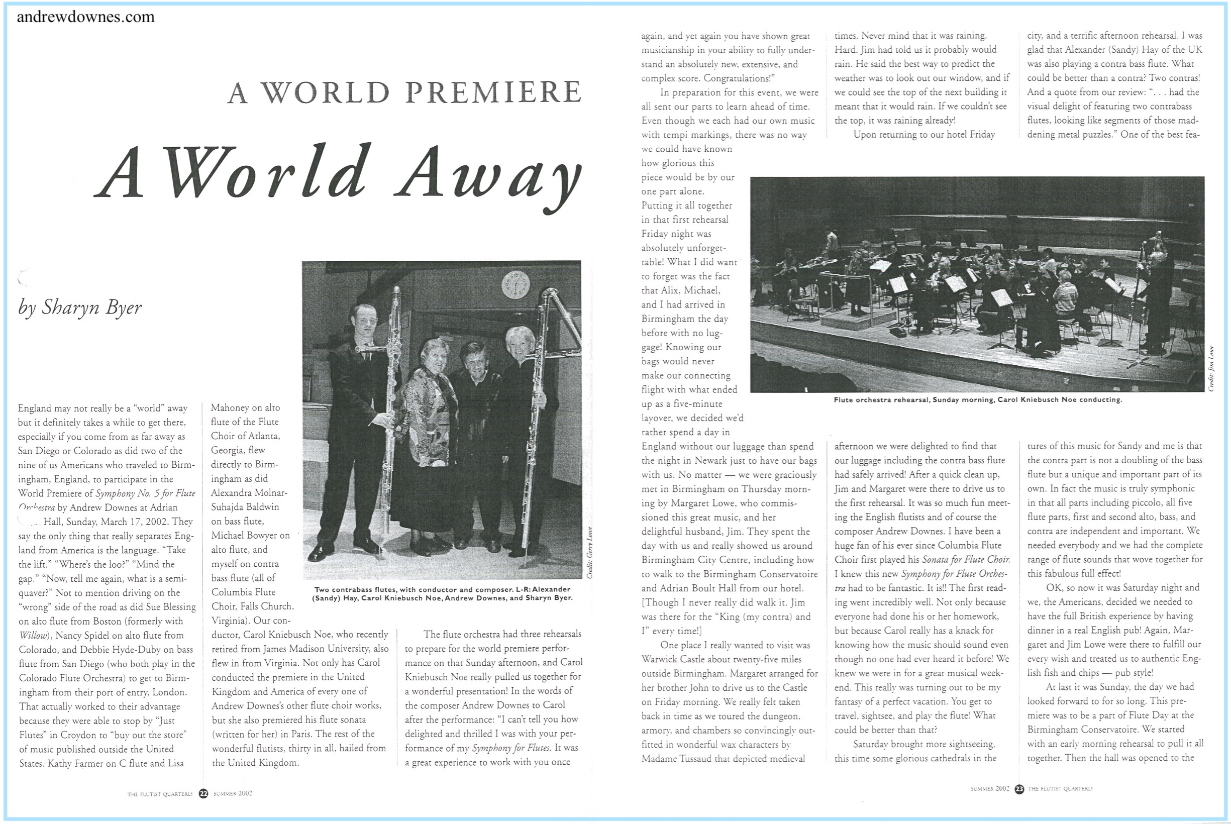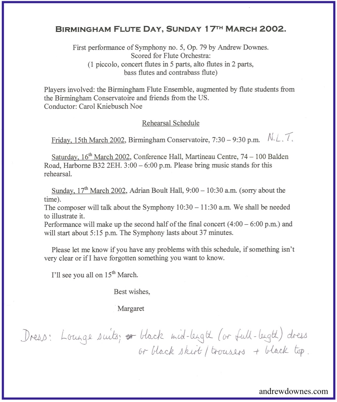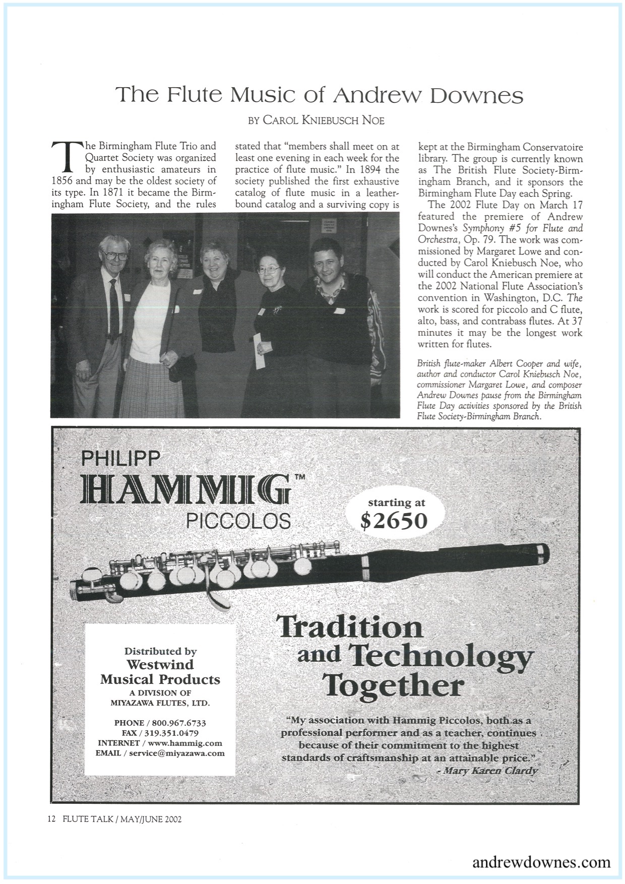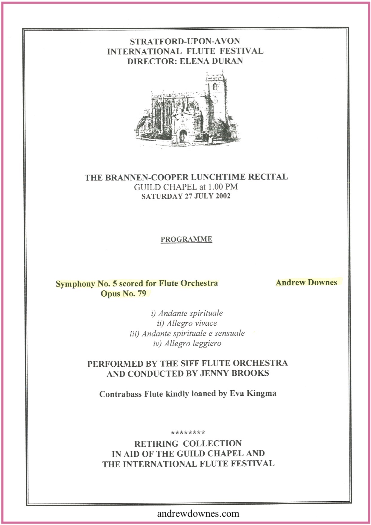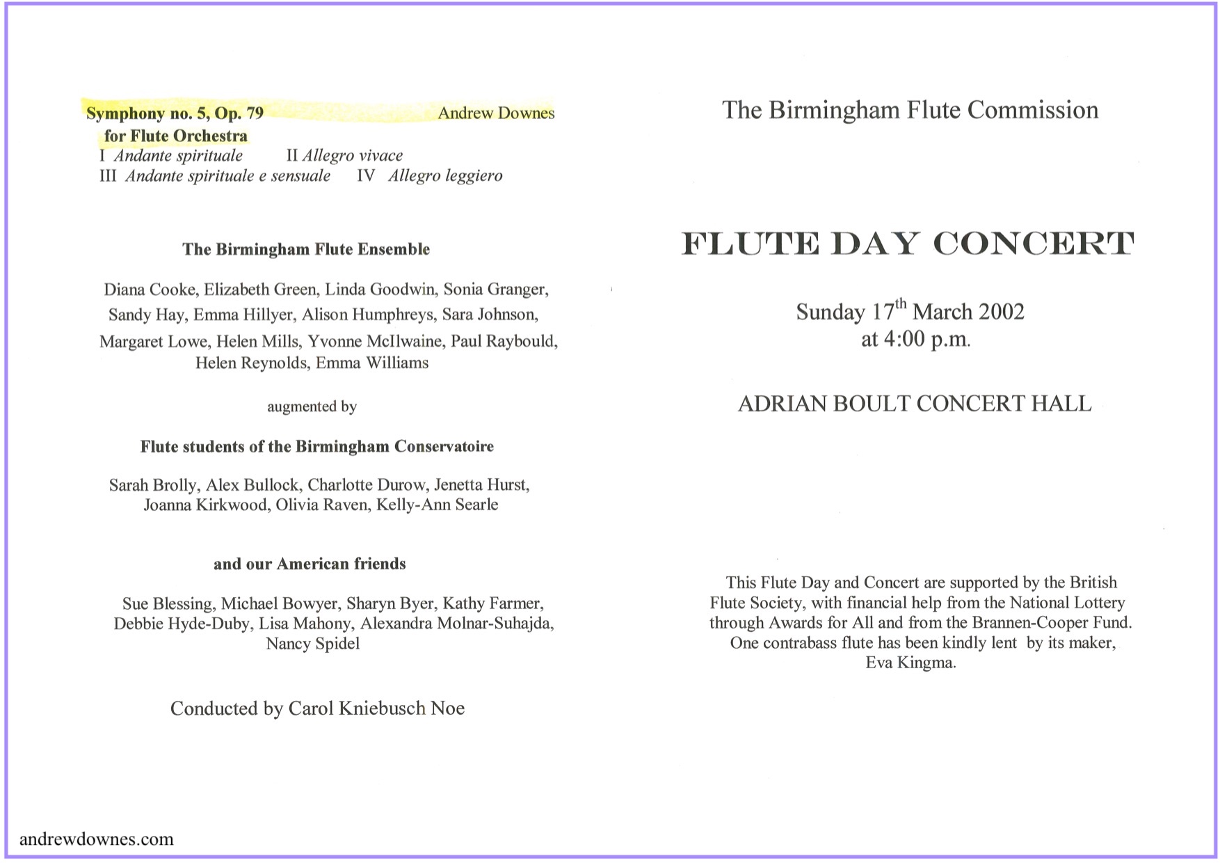 Margaret asked her favourite conductor, the superb Carol Kniebusch Noe, to conduct the Birmingham Professional Flute Ensemble in the premiere in the Adrian Boult Hall at Birmingham Conservatoire on March 17th 2002, with financial assistance provided by the Brannen-Cooper Fund. Carol flew over from the USA with a number of excellent American professional flutists, who had already played Andrew’s music and who were very excited to come on the trip to play in the Symphony.