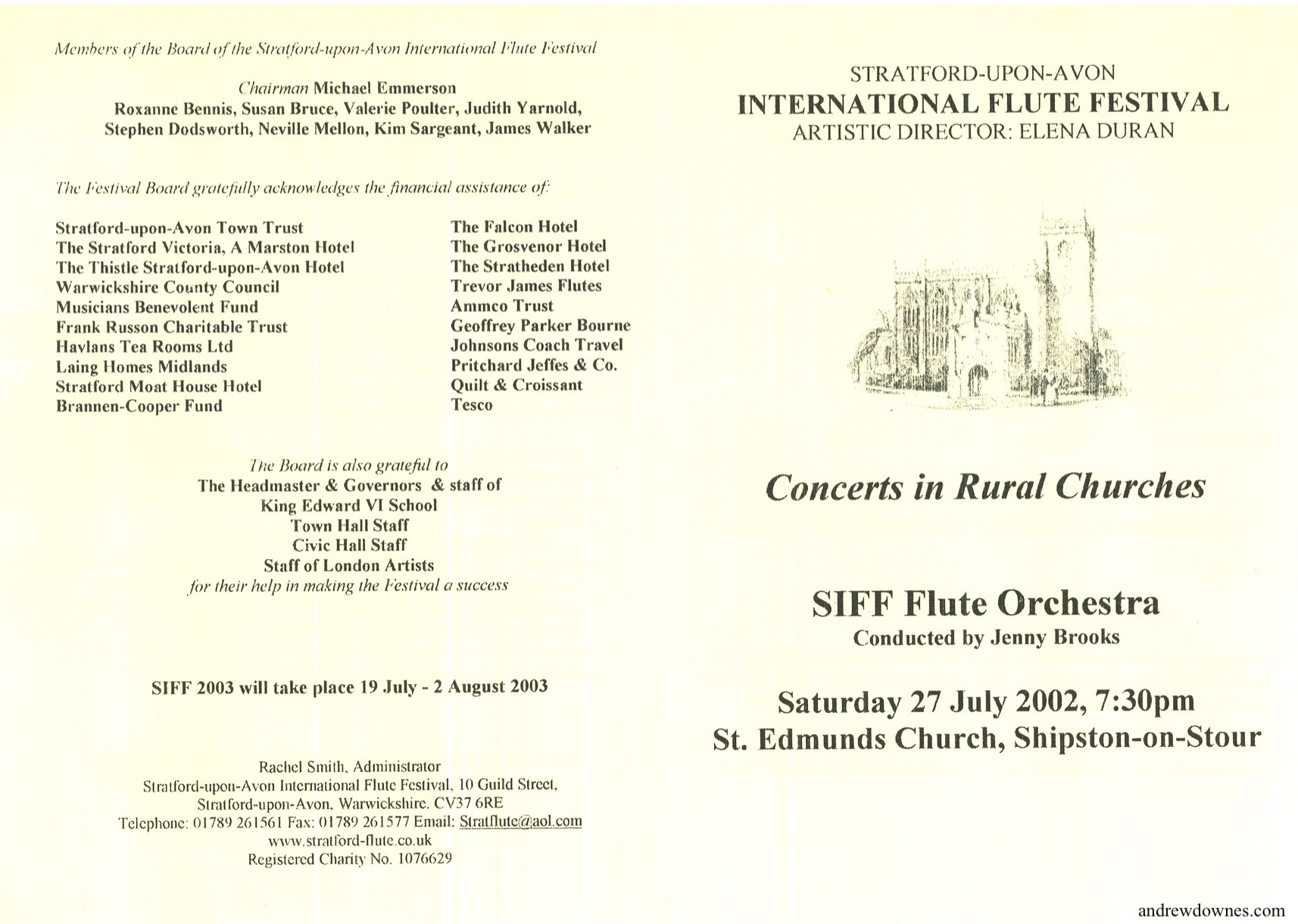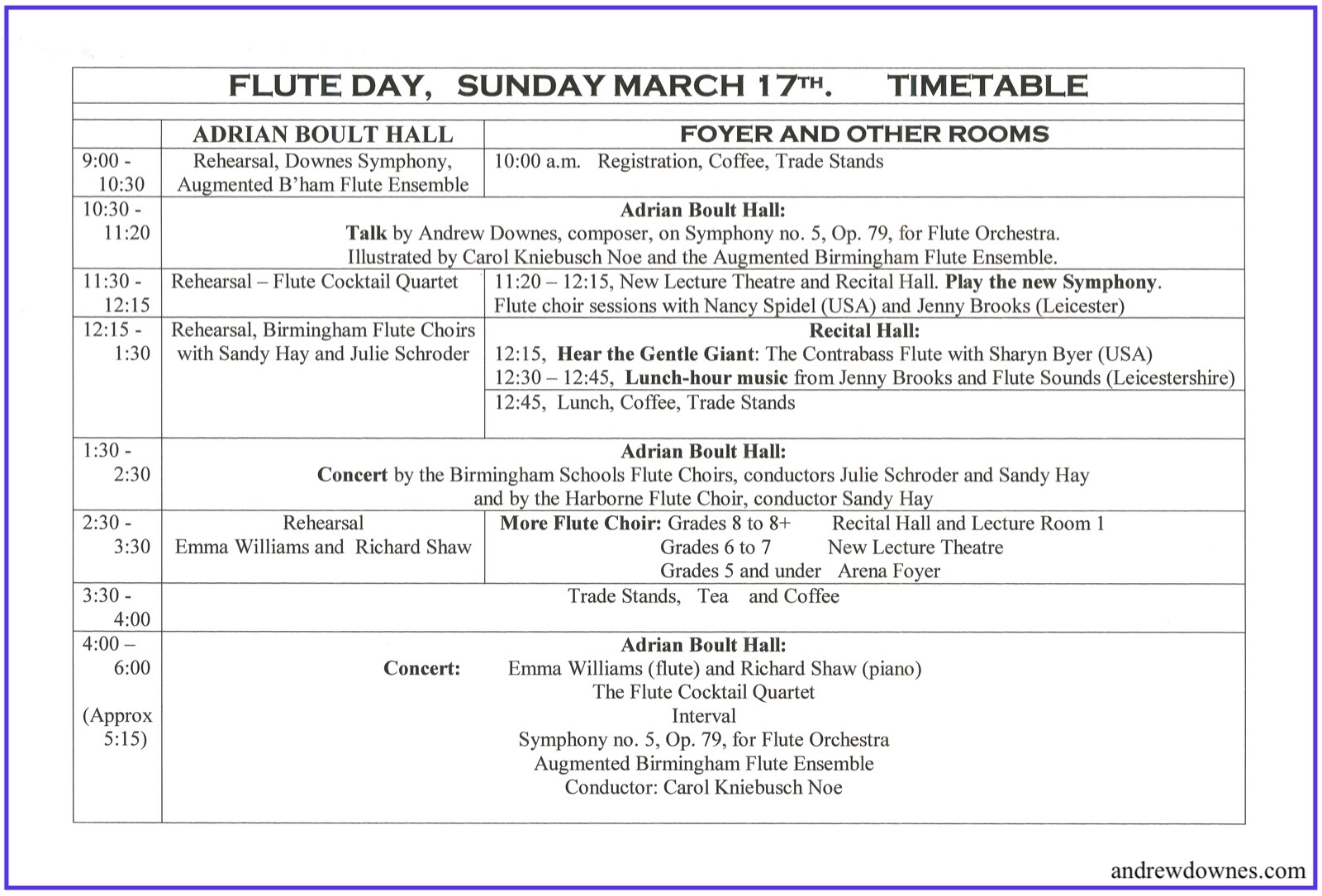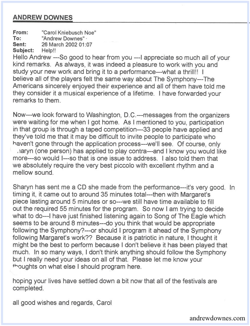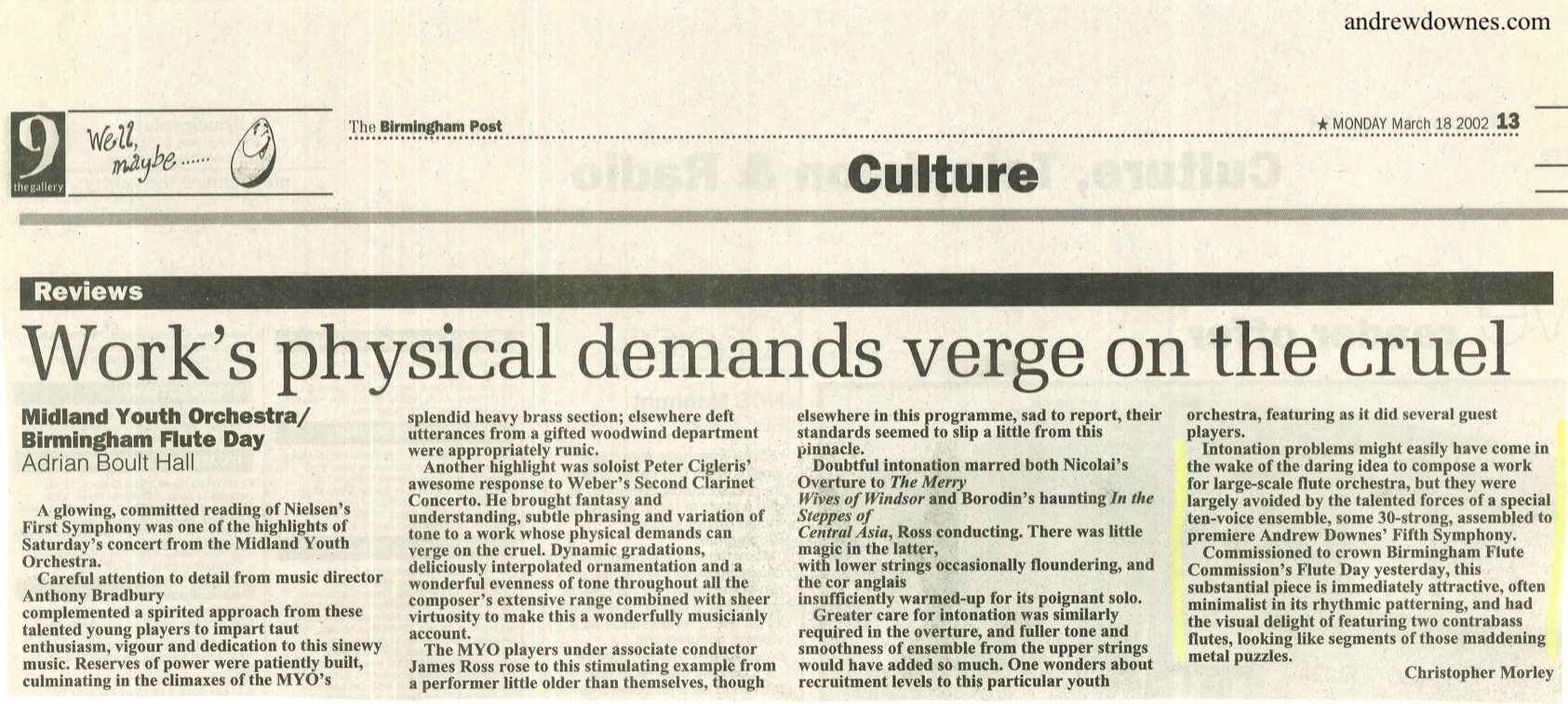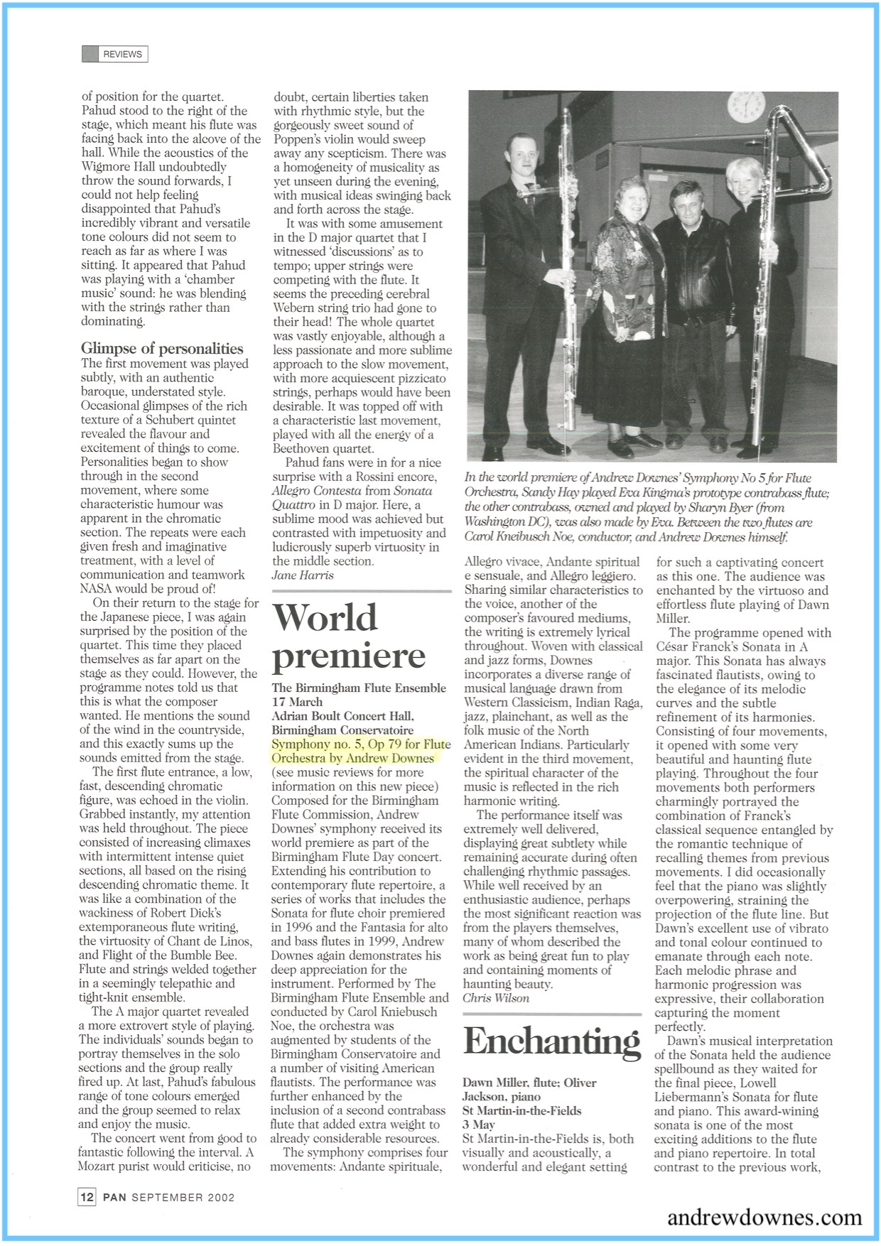 Margaret asked her favourite conductor, the superb Carol Kniebusch Noe, to conduct the Birmingham Professional Flute Ensemble in the premiere in the Adrian Boult Hall at Birmingham Conservatoire on March 17th 2002, with financial assistance provided by the Brannen-Cooper Fund. Carol flew over from the USA with a number of excellent American professional flutists, who had already played Andrew’s music and who were very excited to come on the trip to play in the Symphony.
