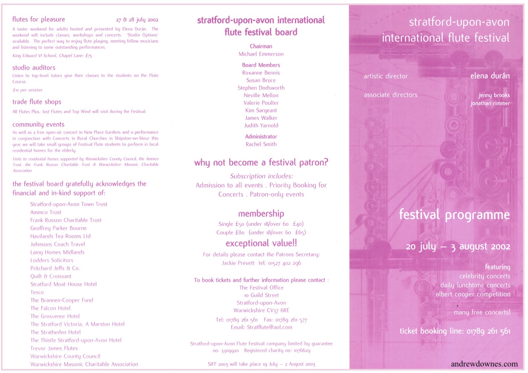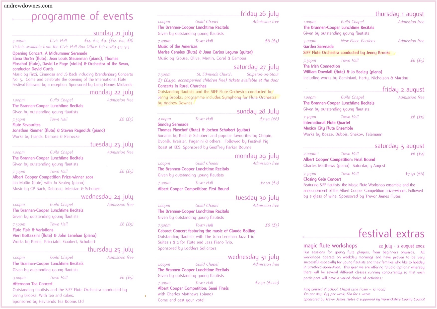 Flutist Margaret Lowe, whose contribution to the promotion of all of Andrew’s music for flutes was immense, commissioned 3 works from Andrew, each one of which was for her Birmingham Flute Commission Flute Day (later known as the National Flute Day), which she organised at Birmingham Conservatoire once every two years, inviting flutists from all over the UK and the USA.