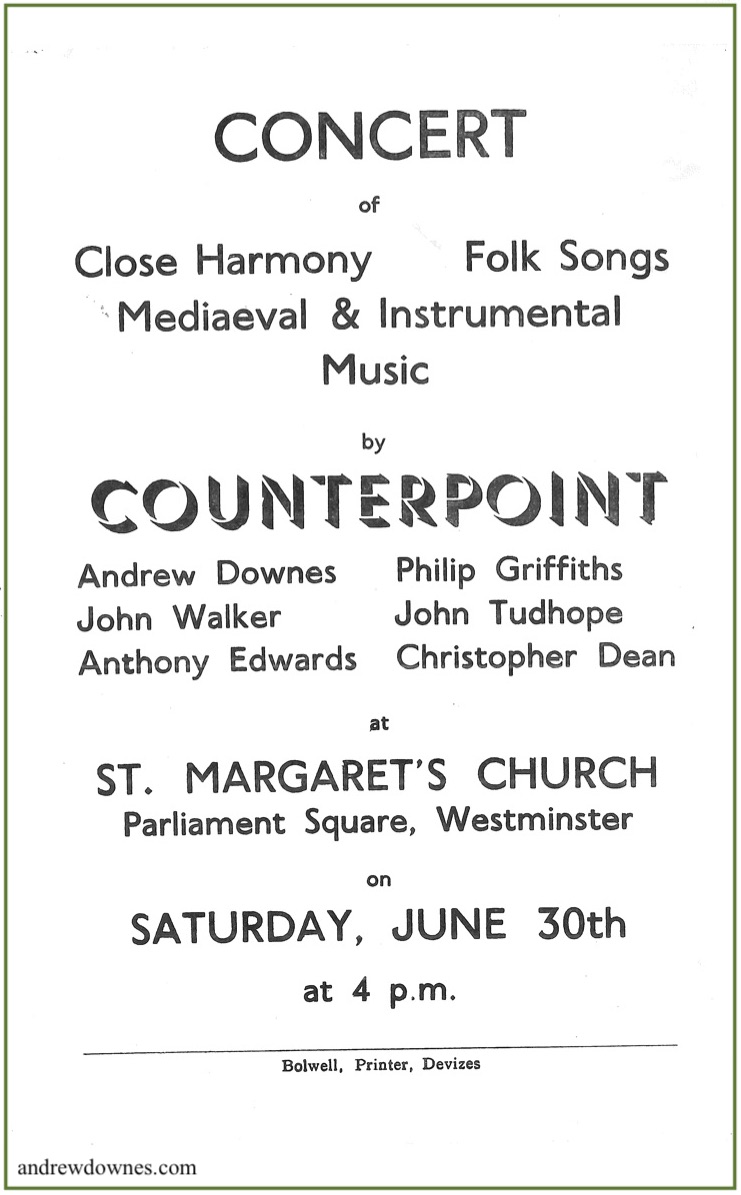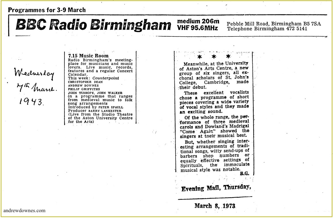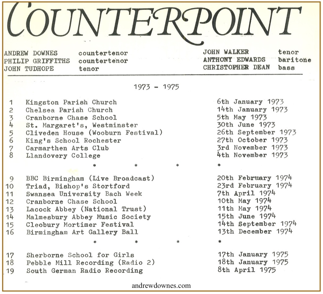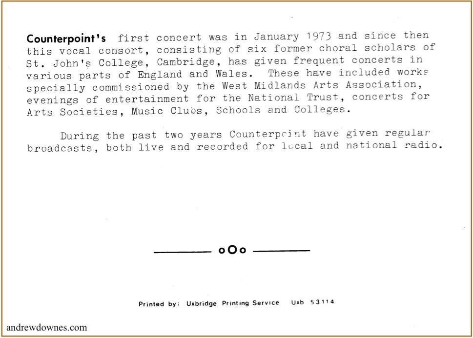 Between 1969 and 1972 Andrew was a choral scholar at St John’s College, Cambridge. When his year group in the choir left St John’s after their degrees, they formed a vocal group which they called 'Counterpoint', and which was so good, they immediately got concert engagements all over the country. I went to see them in a concert in Belsize Park in London (I lived in London at the time). They made a wonderful, polished sound together. The ex-choral scholars from St John's College, Cambridge were: Andrew himself and Philip Griffiths (countertenors), John Tudhope and John Walker (tenors), Anthony Edwards and Christopher Dean (basses).