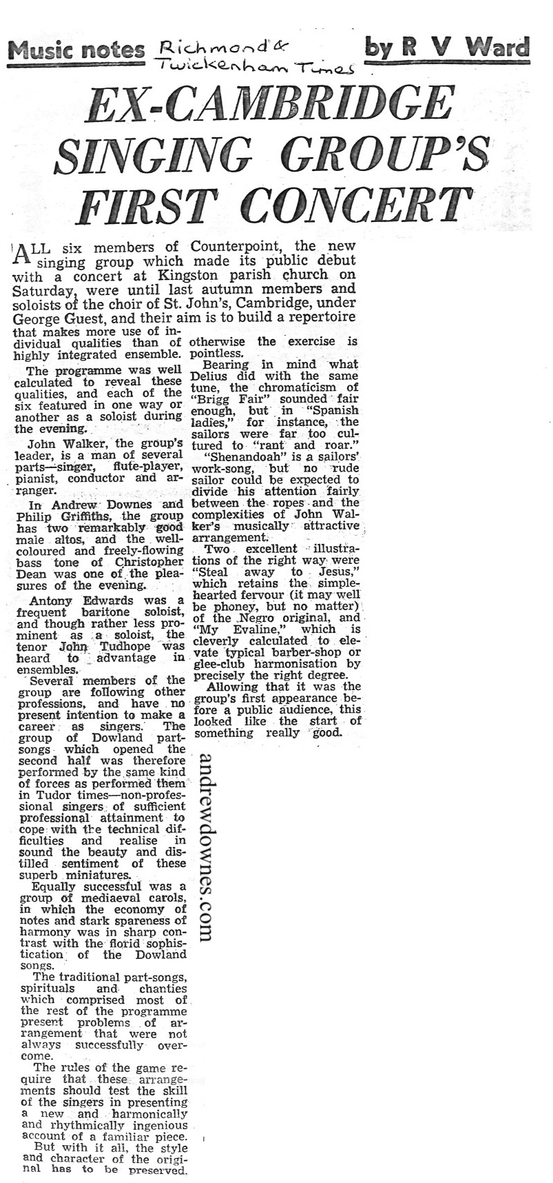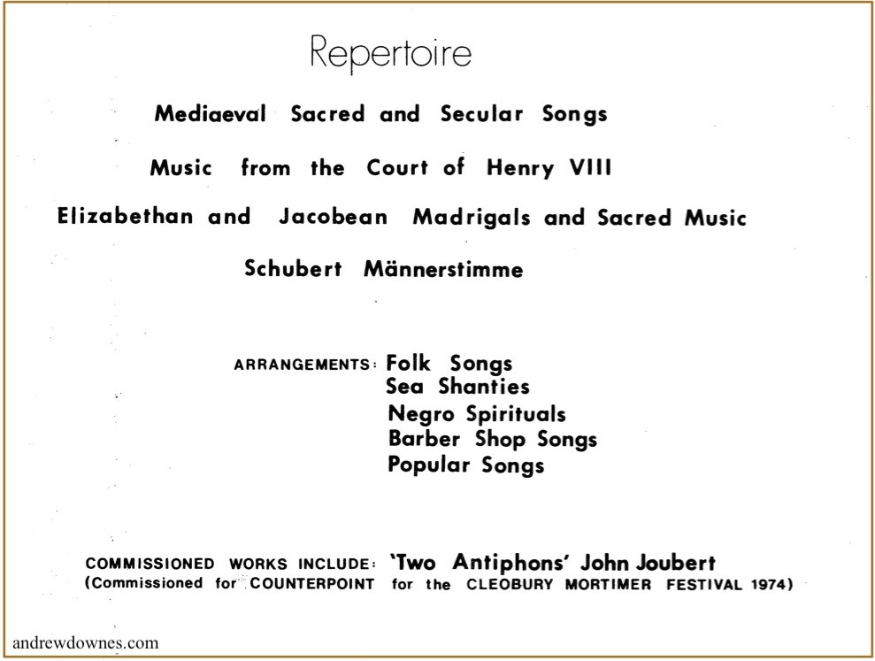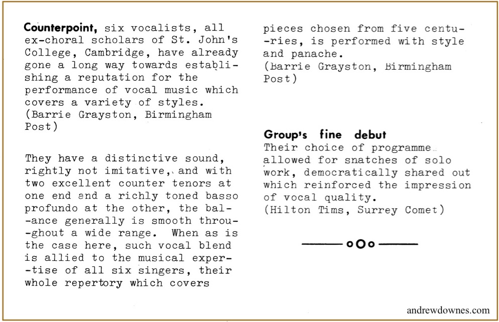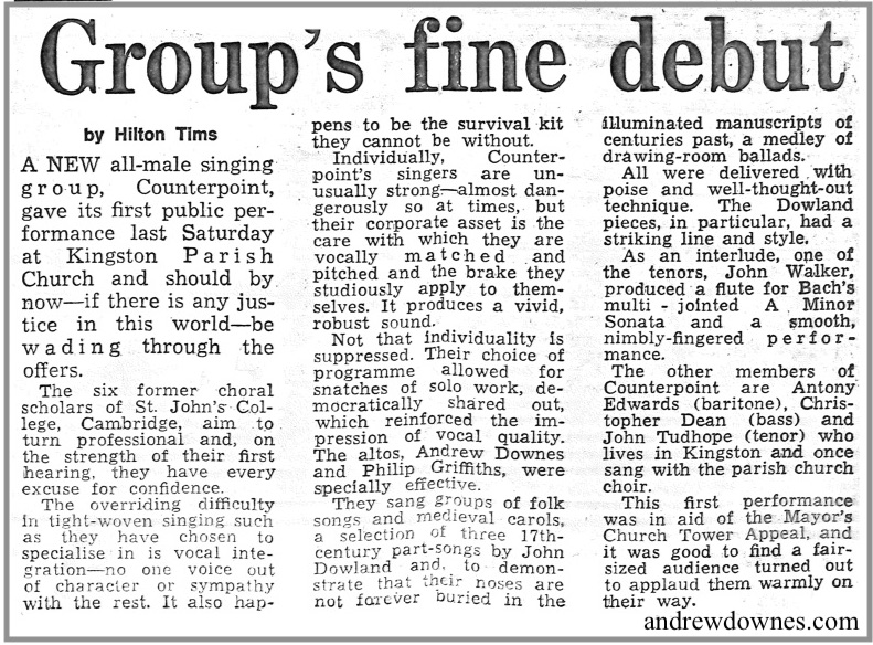Between 1969 and 1972 Andrew was a choral scholar at St John’s College, Cambridge. When his year group in the choir left St John’s after their degrees, they formed a vocal group which they called 'Counterpoint', and which was so good, they immediately got concert engagements all over the country. I went to see them in a concert in Belsize Park in London (I lived in London at the time). They made a wonderful, polished sound together. The ex-choral scholars from St John's College, Cambridge were: Andrew himself and Philip Griffiths (countertenors), John Tudhope and John Walker (tenors), Anthony Edwards and Christopher Dean (basses).